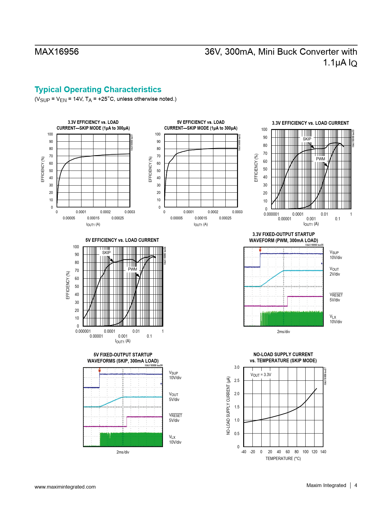 MAX16956 toc06 3.0 VSUP V 10V/div OUT = 3.3V 2.5 MAX16956 toc07 VOUT 2.0 5V/div 1.5 VRESET 5V/div 1.0 NO-LOAD SUPPLY CURRENT (μA) 0.5 VLX 10V/div 0 2ms/div -40 -20 0 20 40 60 80 100 120 140 TEMPERATURE (°C) www.maximintegrated.com Maxim Integrated │ 4