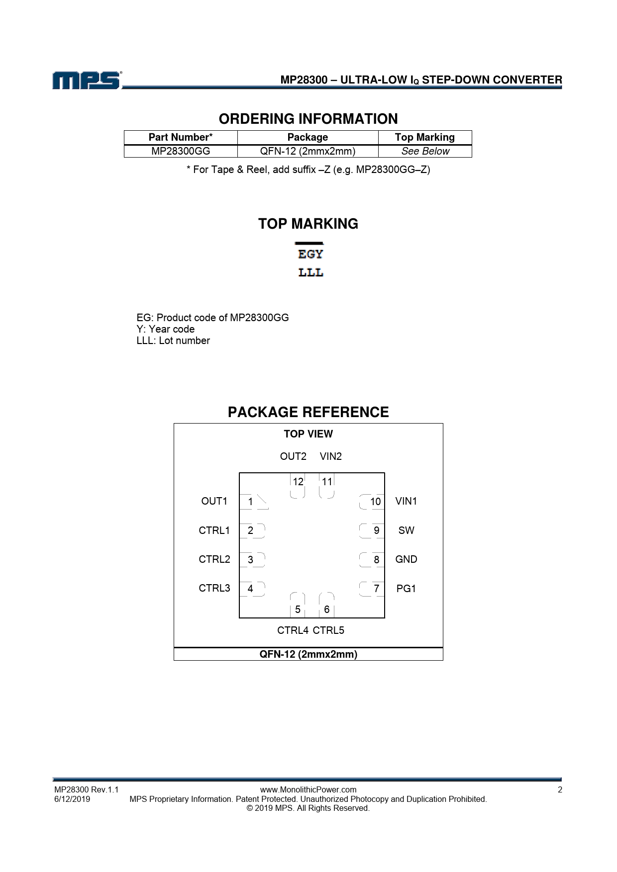 MP28300GG QFN-12 (2mmx2mm) See Below * For Tape & Reel, add suffix –Z (e.g. MP28300GG–Z)