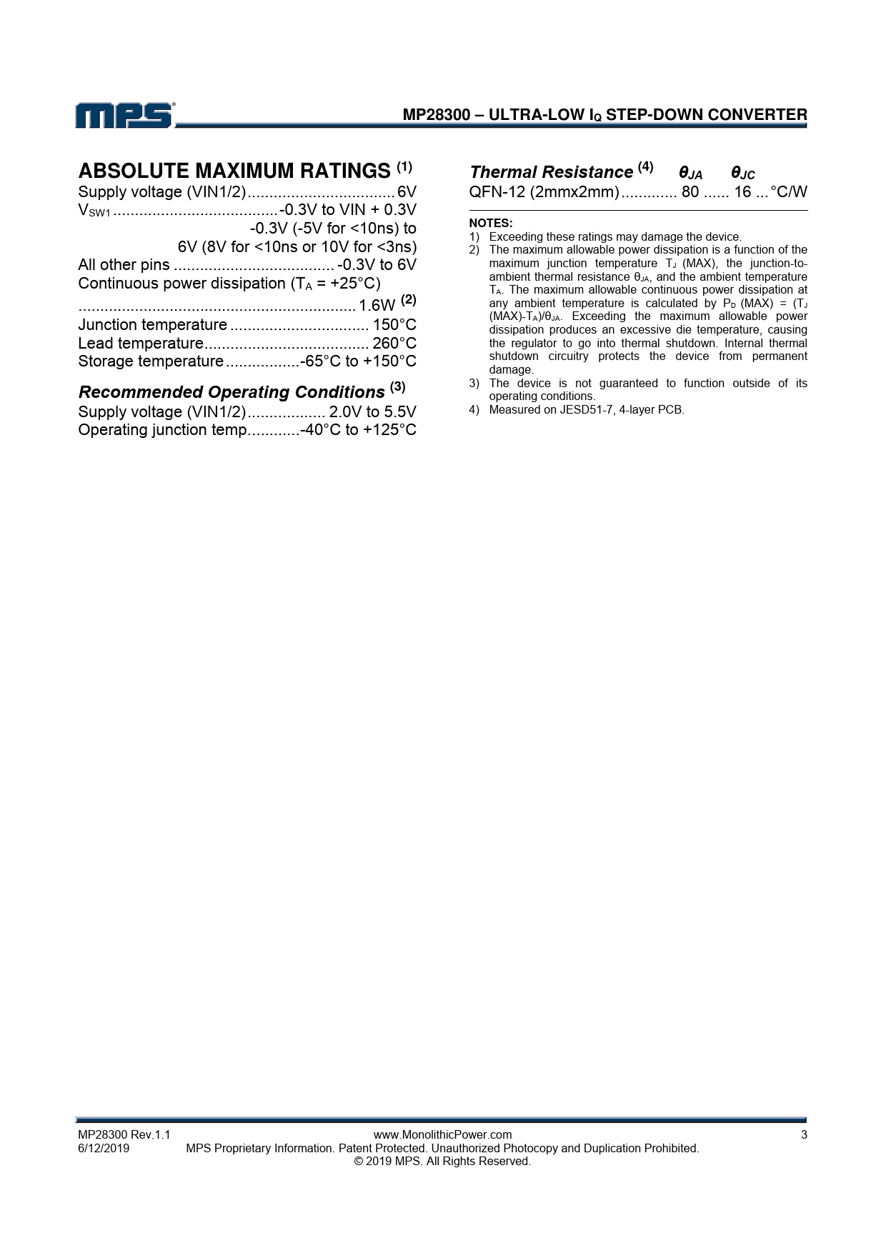 | Pages / Page | 20 / 3 — MP28300 – ULTRA-LOW IQ STEP-DOWN CONVERTER. ABSOLUTE MAXIMUM RATINGS (1). … |