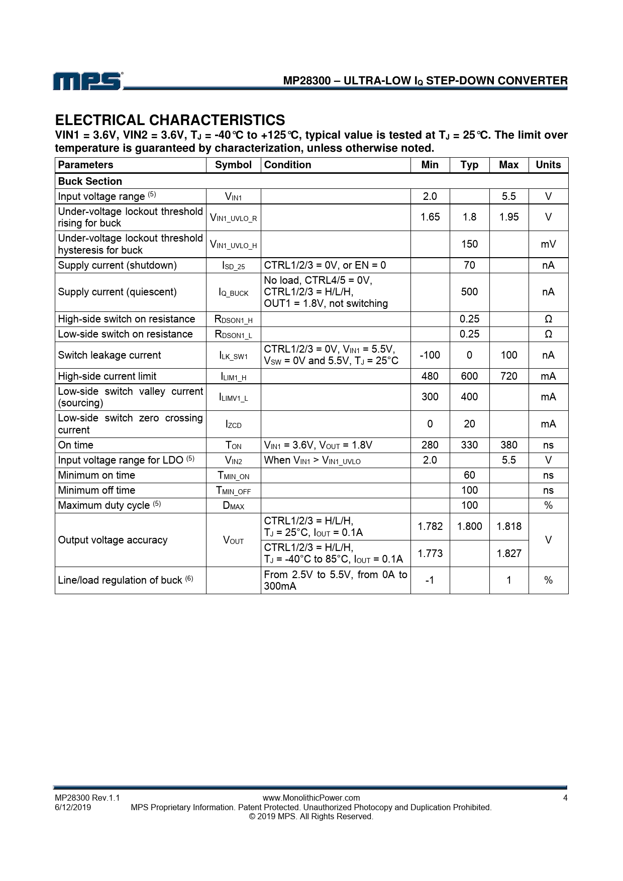 MP28300 – ULTRA-LOW IQ STEP-DOWN CONVERTER ELECTRICAL CHARACTERISTICS VIN1 = 3.6V, VIN2 = 3.6V, TJ = -40°C to +125°C, typical value is tested at TJ = 25°C. The limit over temperature is guaranteed by characterization, unless otherwise noted. Parameters Symbol Condition Min Typ Max Units Buck Section