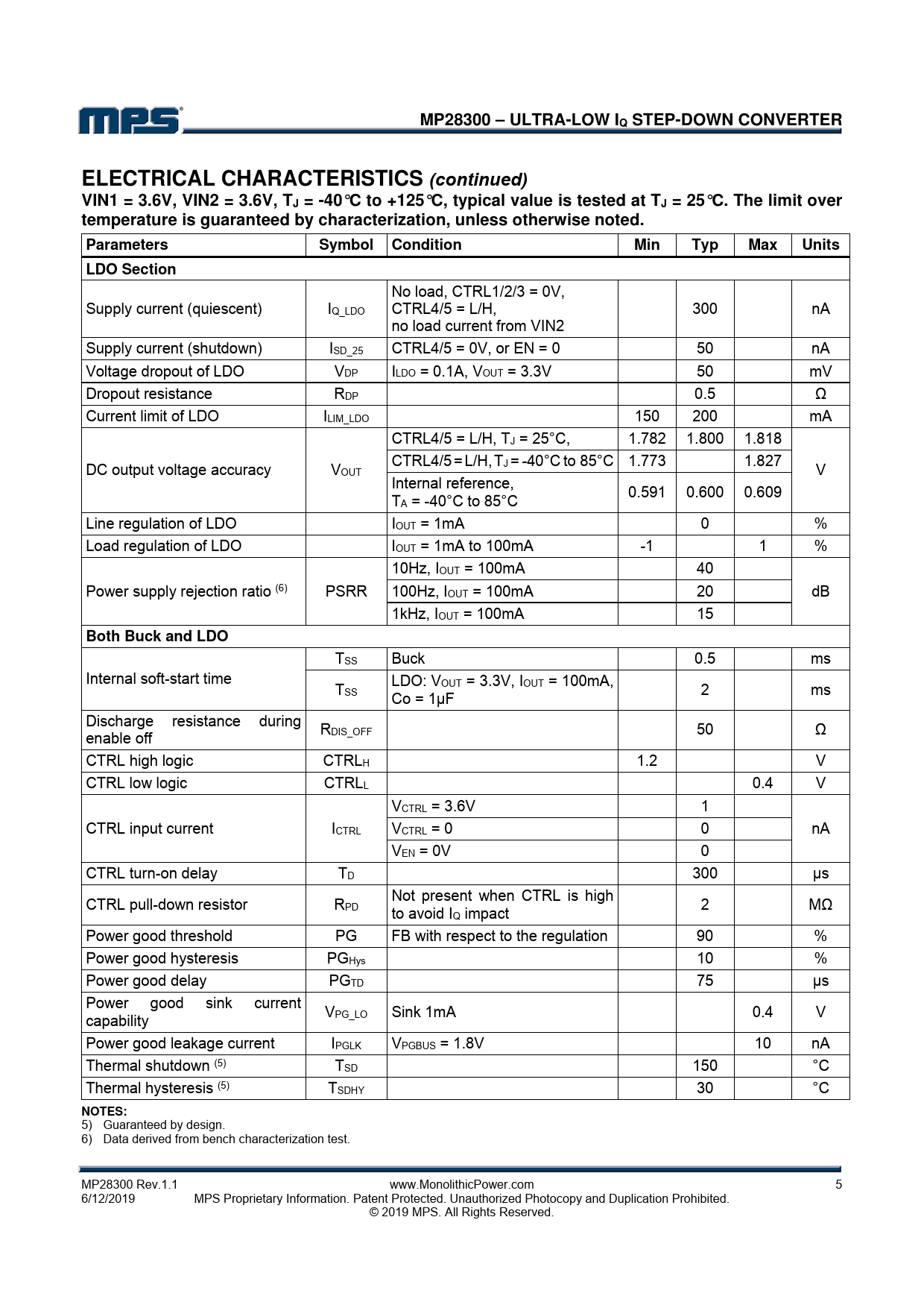 | Pages / Page | 20 / 5 — MP28300 – ULTRA-LOW IQ STEP-DOWN CONVERTER. ELECTRICAL CHARACTERISTICS … |