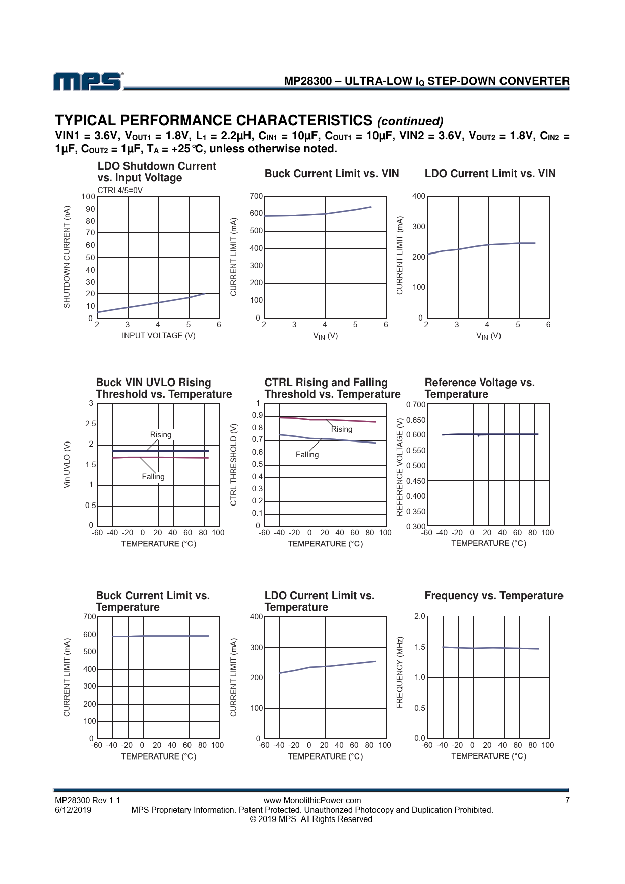 MP28300 – ULTRA-LOW IQ STEP-DOWN CONVERTER TYPICAL PERFORMANCE CHARACTERISTICS (continued) VIN1 = 3.6V, VOUT1 = 1.8V, L1 = 2.2µH, CIN1 = 10µF, COUT1 = 10µF, VIN2 = 3.6V, VOUT2 = 1.8V, CIN2 = 1µF, COUT2 = 1µF, TA = +25°C, unless otherwise noted. LDO Shutdown Current Buck Current Limit vs. VIN LDO Current Limit vs. VIN vs. Input Voltage