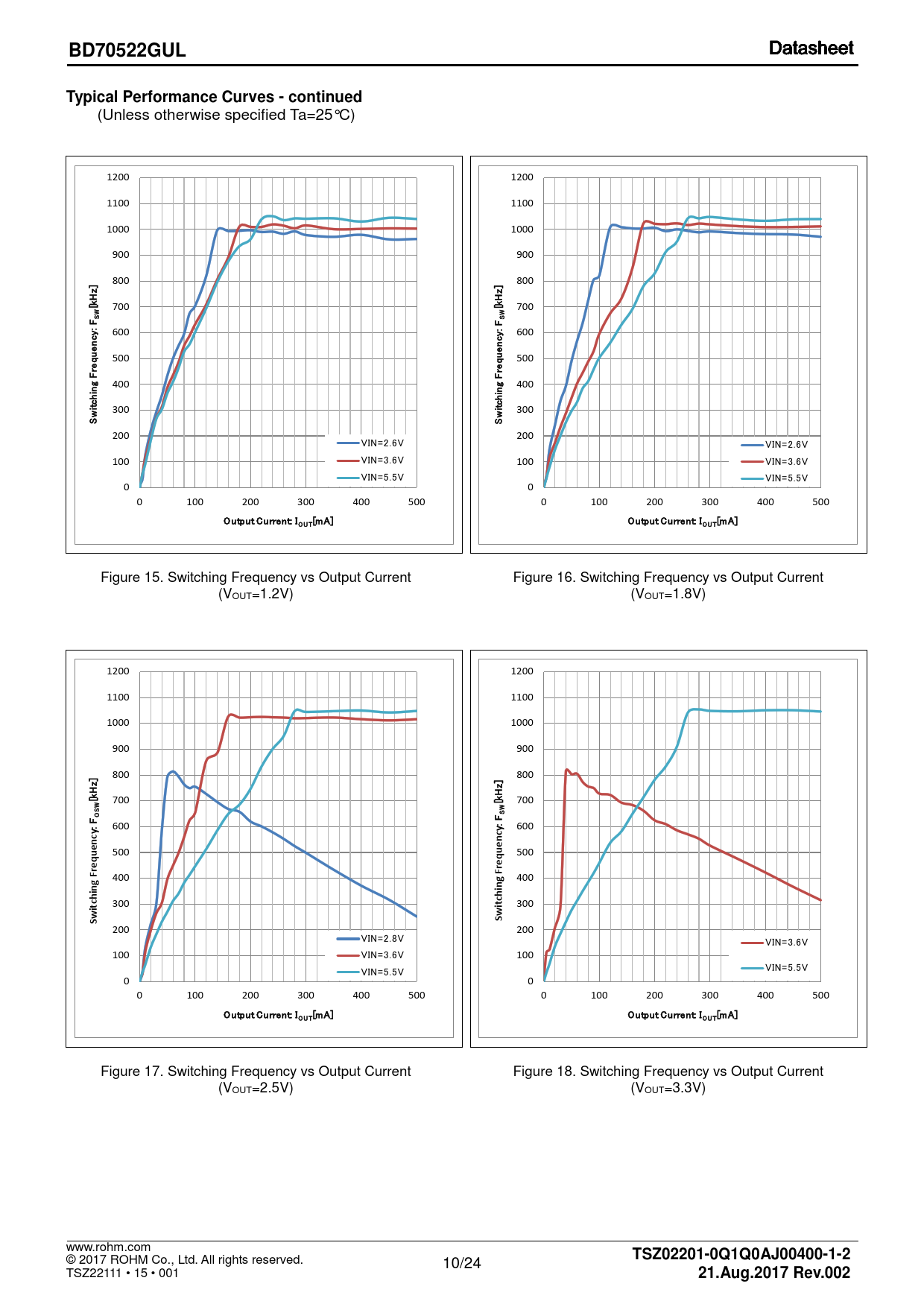 200 200 VIN=2.8V VIN=3.6V 100 VIN=3.6V 100 VIN=5.5V VIN=5.5V 0 0 0 100 200 300 400 500 0 100 200 300 400 500 Output Current: I [mA] Output Current: I [mA] OUT OUT Figure 17. Switching Frequency vs Output Current Figure 18. Switching Frequency vs Output Current (VOUT=2.5V) (VOUT=3.3V) www.rohm.com