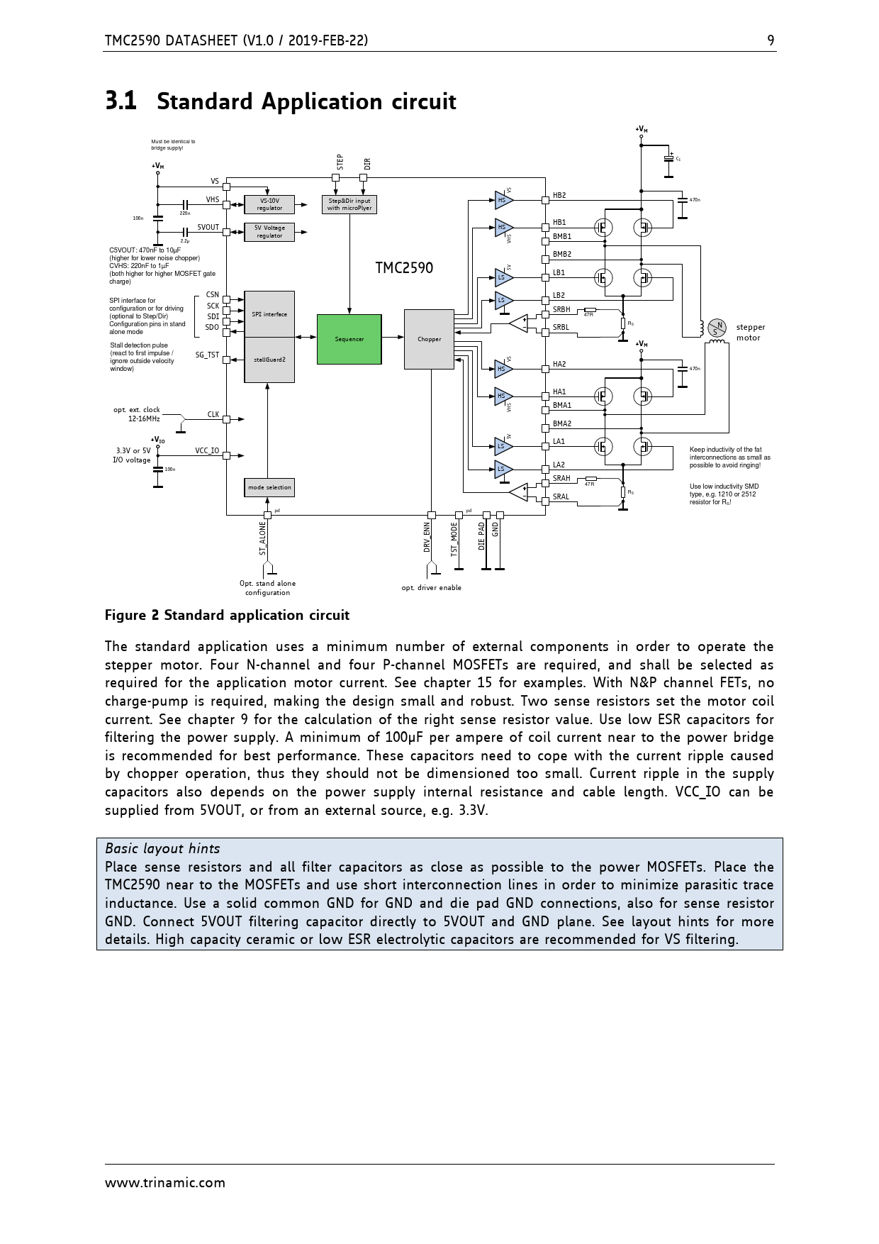 The standard application uses a minimum number of external components in order to operate the stepper motor. Four N-channel and four P-channel MOSFETs are required, and shall be selected as required for the application motor current. See chapter 15 for examples. With N&P channel FETs, no charge-pump is required, making the design small and robust. Two sense resistors set the motor coil current. See chapter 9 for the calculation of the right sense resistor value. Use low ESR capacitors for filtering the power supply. A minimum of 100µF per ampere of coil current near to the power bridge is recommended for best performance. These capacitors need to cope with the current ripple caused by chopper operation, thus they should not be dimensioned too small. Current ripple in the supply capacitors also depends on the power supply internal resistance and cable length. VCC_IO can be supplied from 5VOUT, or from an external source, e.g. 3.3V. Basic layout hints Place sense resistors and all filter capacitors as close as possible to the power MOSFETs. Place the TMC2590 near to the MOSFETs and use short interconnection lines in order to minimize parasitic trace inductance. Use a solid common GND for GND and die pad GND connections, also for sense resistor GND. Connect 5VOUT filtering capacitor directly to 5VOUT and GND plane. See layout hints for more details. High capacity ceramic or low ESR electrolytic capacitors are recommended for VS filtering. www.trinamic.com