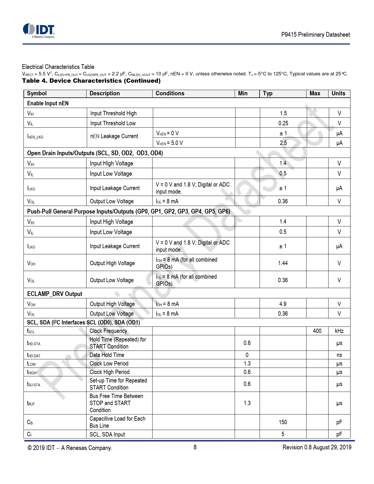 P9415 Preliminary Datasheet Electrical Characteristics Table VRECT = 5.5 V1, CLDO1P8_OUT = CLDO5P0_OUT = 2.2 μF, CMLDO_VOUT = 10 μF, nEN = 0 V, unless otherwise noted. TJ =-5C to 125C, Typical values are at 25°C.