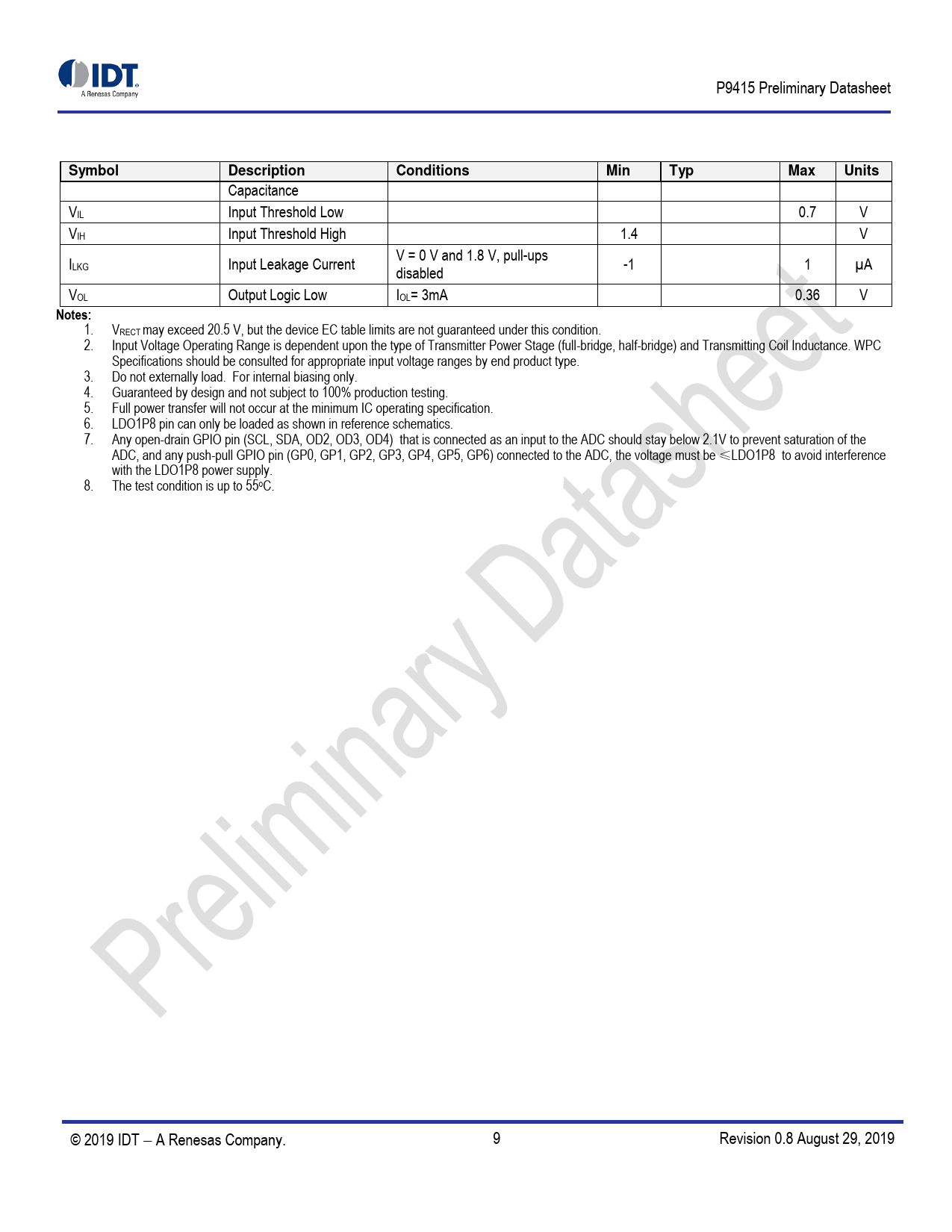 1. VRECT may exceed 20.5 V, but the device EC table limits are not guaranteed under this condition. 2. Input Voltage Operating Range is dependent upon the type of Transmitter Power Stage (ful -bridge, half-bridge) and Transmitting Coil Inductance. WPC Specifications should be consulted for appropriate input voltage ranges by end product type. 3. Do not external y load. For internal biasing only. 4. Guaranteed by design and not subject to 100% production testing. 5. Full power transfer wil not occur at the minimum IC operating specification. 6. LDO1P8 pin can only be loaded as shown in reference schematics. 7. Any open-drain GPIO pin (SCL, SDA, OD2, OD3, OD4) that is connected as an input to the ADC should stay below 2.1V to prevent saturation of the ADC, and any push-pul GPIO pin (GP0, GP1, GP2, GP3, GP4, GP5, GP6) connected to the ADC, the voltage must be ≤LDO1P8 to avoid interference with the LDO1P8 power supply. 8. The test condition is up to 55oC. © 2019 IDT A Renesas Company. 9 Revision 0.8 August 29, 2019