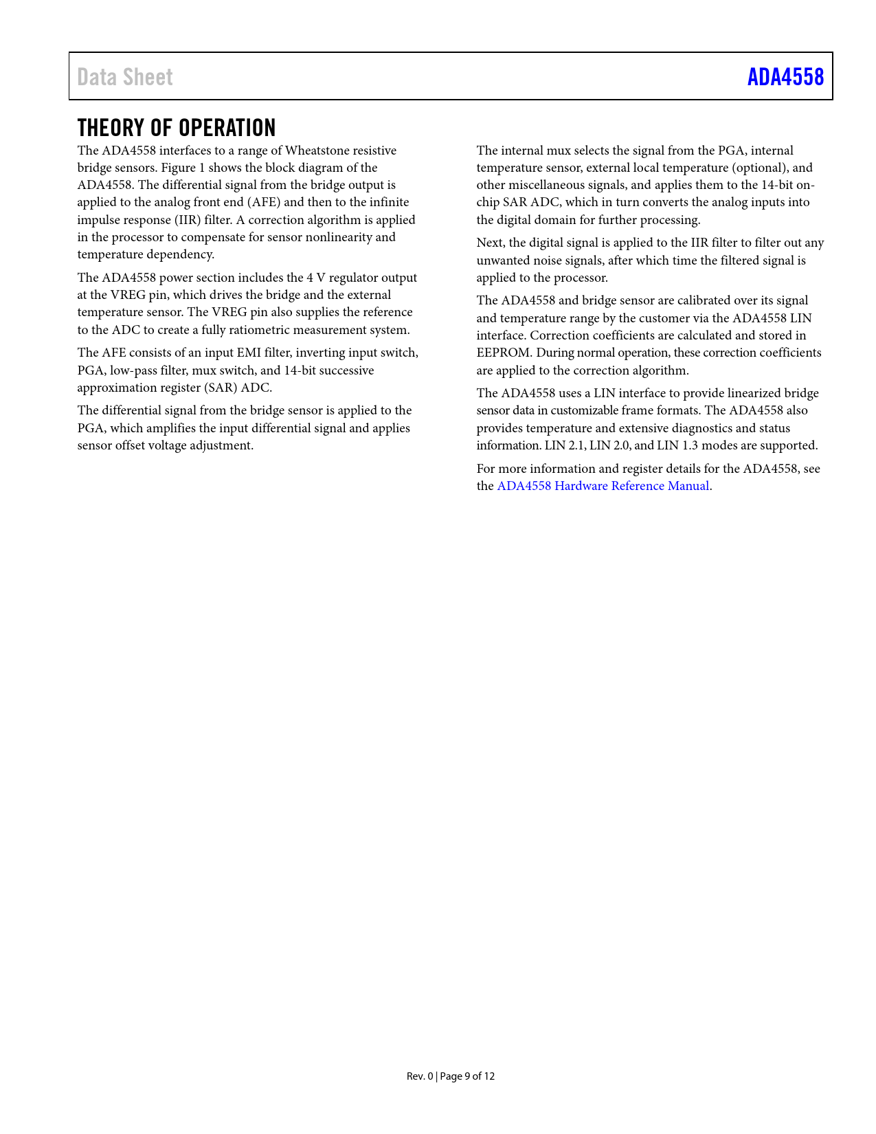 link to page 1 Data SheetADA4558THEORY OF OPERATION The ADA4558 interfaces to a range of Wheatstone resistive The internal mux selects the signal from the PGA, internal bridge sensors. Figure 1 shows the block diagram of the temperature sensor, external local temperature (optional), and ADA4558. The differential signal from the bridge output is other miscellaneous signals, and applies them to the 14-bit on- applied to the analog front end (AFE) and then to the infinite chip SAR ADC, which in turn converts the analog inputs into impulse response (IIR) filter. A correction algorithm is applied the digital domain for further processing. in the processor to compensate for sensor nonlinearity and Next, the digital signal is applied to the IIR filter to filter out any temperature dependency. unwanted noise signals, after which time the filtered signal is The ADA4558 power section includes the 4 V regulator output applied to the processor. at the VREG pin, which drives the bridge and the external The ADA4558 and bridge sensor are calibrated over its signal temperature sensor. The VREG pin also supplies the reference and temperature range by the customer via the ADA4558 LIN to the ADC to create a ful y ratiometric measurement system. interface. Correction coefficients are calculated and stored in The AFE consists of an input EMI filter, inverting input switch, EEPROM. During normal operation, these correction coefficients PGA, low-pass filter, mux switch, and 14-bit successive are applied to the correction algorithm. approximation register (SAR) ADC. The ADA4558 uses a LIN interface to provide linearized bridge The differential signal from the bridge sensor is applied to the sensor data in customizable frame formats. The ADA4558 also PGA, which amplifies the input differential signal and applies provides temperature and extensive diagnostics and status sensor offset voltage adjustment. information. LIN 2.1, LIN 2.0, and LIN 1.3 modes are supported. For more information and register details for the ADA4558, see the ADA4558 Hardware Reference Manual. Rev. 0 | Page 9 of 12 Document Outline FEATURES APPLICATIONS GENERAL DESCRIPTION FUNCTIONAL BLOCK DIAGRAM TABLE OF CONTENTS REVISION HISTORY SPECIFICATIONS ABSOLUTE MAXIMUM RATINGS THERMAL RESISTANCE ESD CAUTION PIN CONFIGURATION AND FUNCTION DESCRIPTIONS TYPICAL PERFORMANCE CHARACTERISTICS THEORY OF OPERATION APPLICATIONS INFORMATION TYPICAL CONNECTION DIAGRAM EMC PERFORMANCE PCB LAYOUT GUIDELINES OUTLINE DIMENSIONS ORDERING GUIDE AUTOMOTIVE PRODUCTS