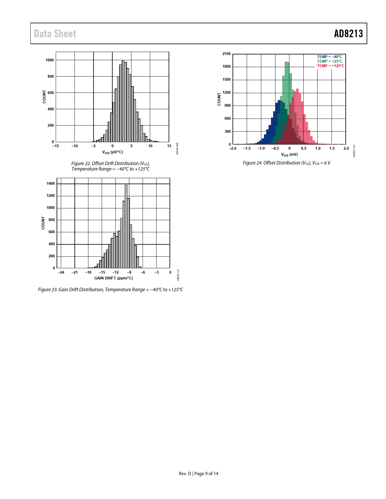 Data SheetAD82132100TEMP = –40°C1000TEMP = +25°C1800TEMP = +125°C80015006001200UNTUNTCOCO 9004006002003000 6 –15–10–50510150 00 3 9- –2.0–1.5–1.0–0.500.51.01.52.0 10 V 63 9- OS (µV/°C) 06 V 63 OS (mV) 06 Figure 22. Offset Drift Distribution (VOS), Figure 24. Offset Distribution (VOS), VCM = 6 V Temperature Range = −40°C to +125°C 140012001000800UNT CO 6004002000 –24 –21 –18 –15 –12–9–6–30 01 1 9- GAIN DRIFT (ppm/°C) 63 06 Figure 23. Gain Drift Distribution, Temperature Range = −40°C to +125°C Rev. D | Page 9 of 14 Document Outline FEATURES APPLICATIONS FUNCTIONAL BLOCK DIAGRAM GENERAL DESCRIPTION TABLE OF CONTENTS REVISION HISTORY SPECIFICATIONS ABSOLUTE MAXIMUM RATINGS ESD CAUTION PIN CONFIGURATION AND FUNCTION DESCRIPTIONS TYPICAL PERFORMANCE CHARACTERISTICS THEORY OF OPERATION APPLICATION NOTES OUTPUT LINEARITY LOW-PASS FILTERING APPLICATIONS INFORMATION HIGH-SIDE CURRENT SENSE WITH A LOW-SIDE SWITCH HIGH-SIDE CURRENT SENSING LOW-SIDE CURRENT SENSING BIDIRECTIONAL CURRENT SENSING OUTLINE DIMENSIONS ORDERING GUIDE AUTOMOTIVE PRODUCTS