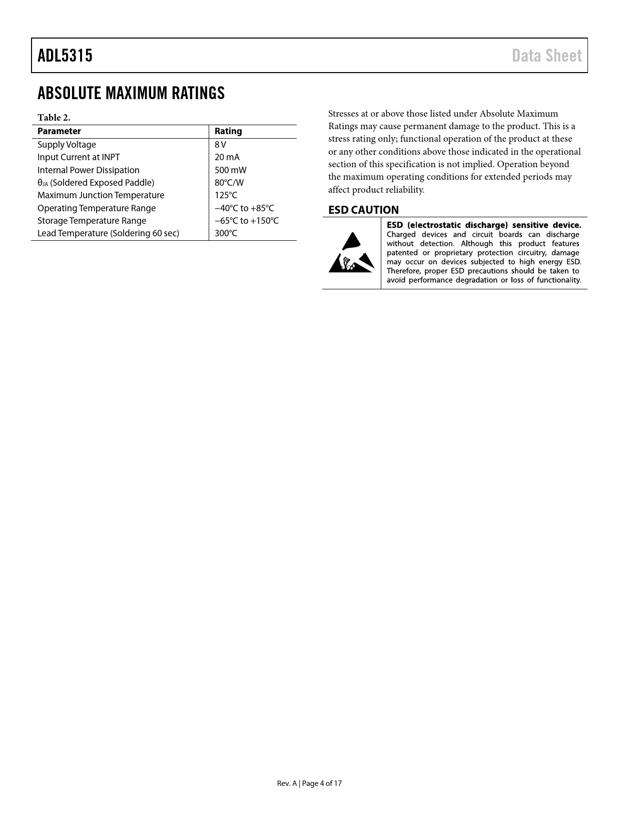 ADL5315Data SheetABSOLUTE MAXIMUM RATINGS Table 2. Stresses at or above those listed under Absolute Maximum ParameterRating Ratings may cause permanent damage to the product. This is a stress rating only; functional operation of the product at these Supply Voltage 8 V Input Current at INPT 20 mA or any other conditions above those indicated in the operational section of this specification is not implied. Operation beyond Internal Power Dissipation 500 mW the maximum operating conditions for extended periods may θJA (Soldered Exposed Paddle) 80°C/W affect product reliability. Maximum Junction Temperature 125°C Operating Temperature Range −40°C to +85°C ESD CAUTION Storage Temperature Range −65°C to +150°C Lead Temperature (Soldering 60 sec) 300°C Rev. A | Page 4 of 17 Document Outline FEATURES APPLICATIONS FUNCTIONAL BLOCK DIAGRAM GENERAL DESCRIPTION TABLE OF CONTENTS REVISION HISTORY SPECIFICATIONS ABSOLUTE MAXIMUM RATINGS ESD CAUTION PIN CONFIGURATION AND FUNCTION DESCRIPTIONS TYPICAL PERFORMANCE CHARACTERISTICS THEORY OF OPERATION BIAS CONTROL INTERFACE NOISE PERFORMANCE MIRROR RESPONSE TIME INPUT CURRENT LIMITING APPLICATIONS AVERAGE POWER MONITORING TRANSLINEAR LOG AMP INTERFACING EXTENDED OPERATING RANGE USING RLIM AS A SECONDARY MONITOR CHARACTERIZATION METHODS EVALUATION BOARD OUTLINE DIMENSIONS ORDERING GUIDE