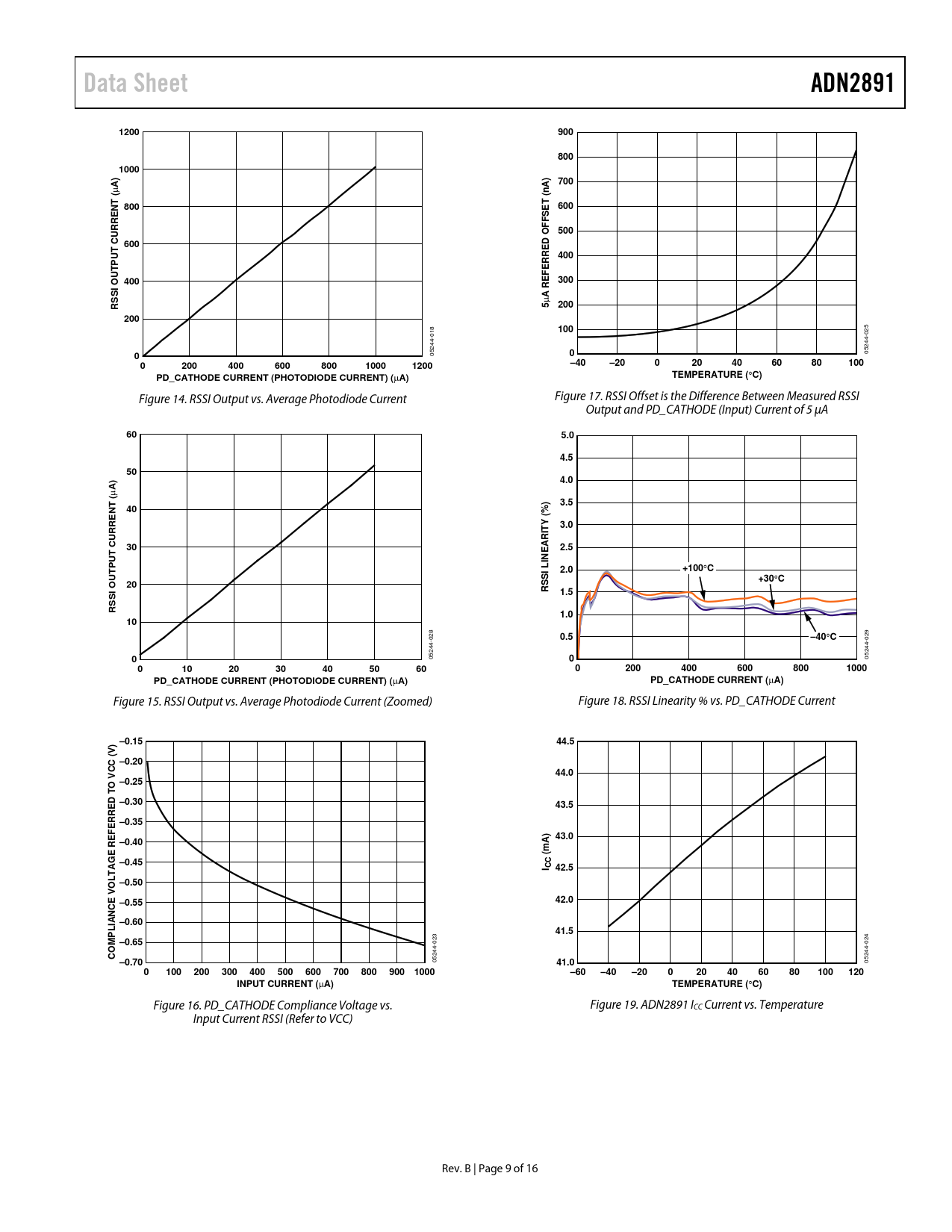 Data SheetADN289112009008001000700 µ A)800600500600400400300 µ A REFERRED OFFSET (nA)RSSI OUTPUT CURRENT (52002001000 05244-018 0 05244-025 020040060080010001200–40–20020406080100PD_CATHODE CURRENT (PHOTODIODE CURRENT) ( µ A)TEMPERATURE ( ° C) Figure 14. RSSI Output vs. Average Photodiode Current Figure 17. RSSI Offset is the Difference Between Measured RSSI Output and PD_CATHODE (Input) Current of 5 µA 605.04.5504.0 µ A)3.5403.0302.52.0+100 ° C+30 ° C20RSSI LINEARITY (%)1.5RSSI OUTPUT CURRENT (1.0100.5–40 ° C0 05244-028 0 05244-029 010203040506002004006008001000PD_CATHODE CURRENT (PHOTODIODE CURRENT) ( µ A)PD_CATHODE CURRENT ( µ A) Figure 15. RSSI Output vs. Average Photodiode Current (Zoomed) Figure 18. RSSI Linearity % vs. PD_CATHODE Current –0.1544.5–0.2044.0–0.25–0.3043.5–0.3543.0–0.40(mA)–0.45I CC 42.5–0.50–0.5542.0–0.6041.5–0.65COMPLIANCE VOLTAGE REFERRED TO VCC (V) –0.70 05244-023 41.0 05244-024 01002003004005006007008009001000–60–40–20020406080100120INPUT CURRENT ( µ A)TEMPERATURE ( ° C) Figure 16. PD_CATHODE Compliance Voltage vs. Figure 19. ADN2891 ICC Current vs. Temperature Input Current RSSI (Refer to VCC) Rev. B | Page 9 of 16 Document Outline FEATURES APPLICATIONS GENERAL DESCRIPTION FUNCTIONAL BLOCK DIAGRAM SPECIFICATIONS ABSOLUTE MAXIMUM RATINGS THERMAL RESISTANCE ESD CAUTION PIN CONFIGURATION AND FUNCTION DESCRIPTIONS TYPICAL PERFORMANCE CHARACTERISTICS THEORY OF OPERATION LIMITING AMPLIFIER Input Buffer CML Output Buffer LOSS OF SIGNAL (LOS) DETECTOR RECEIVED SIGNAL STRENGTH INDICATOR (RSSI) SQUELCH MODE APPLICATIONS PCB DESIGN GUIDELINES Output Buffer Power Supply and Ground Planes PCB Layout Soldering Guidelines for the LFCSP OUTLINE DIMENSIONS ORDERING GUIDE