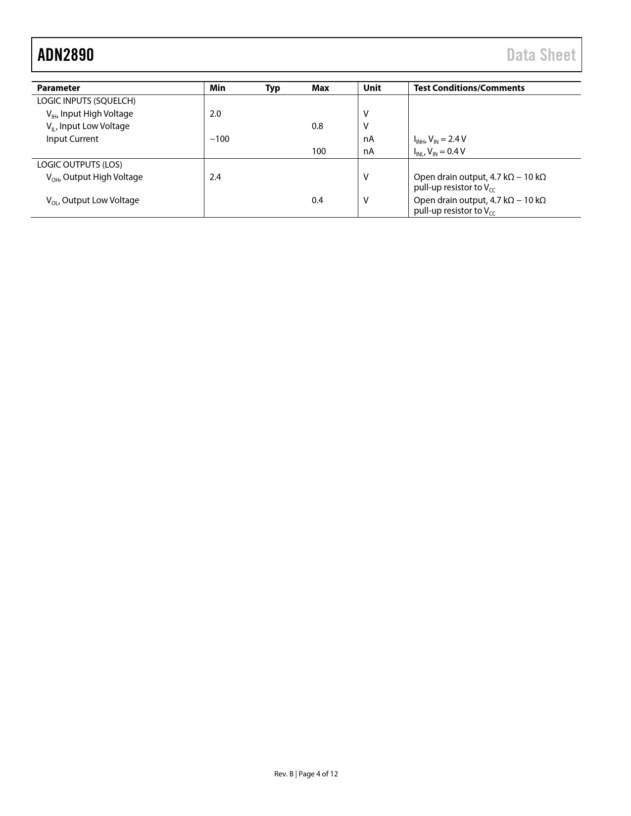 Pages / Page12 / 4 — ADN2890. Data Sheet. Parameter. Min. Typ. Max. Unit. Test …