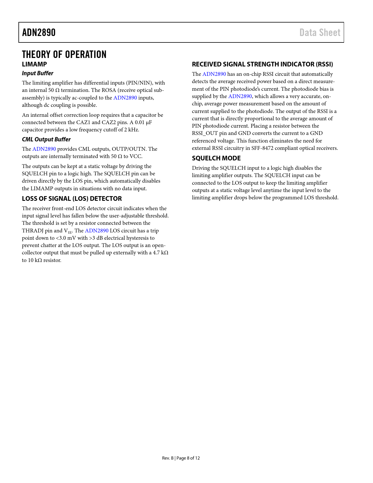 Pages / Page12 / 8 — ADN2890. Data Sheet. THEORY OF OPERATION LIMAMP. RECEIVED SIGNAL STRENGTH …