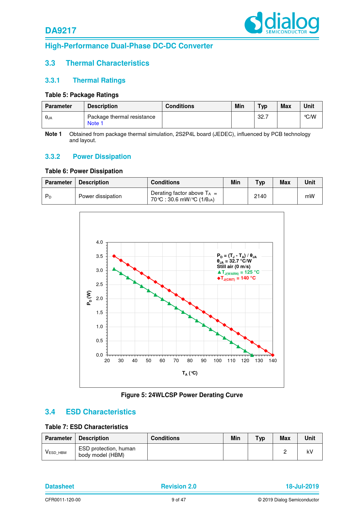 DA9217 High-Performance Dual-Phase DC-DC Converter 3.3 Thermal Characteristics 3.3.1 Thermal Ratings Table 5: Package Ratings Parameter Description Conditions Min Typ Max Unit