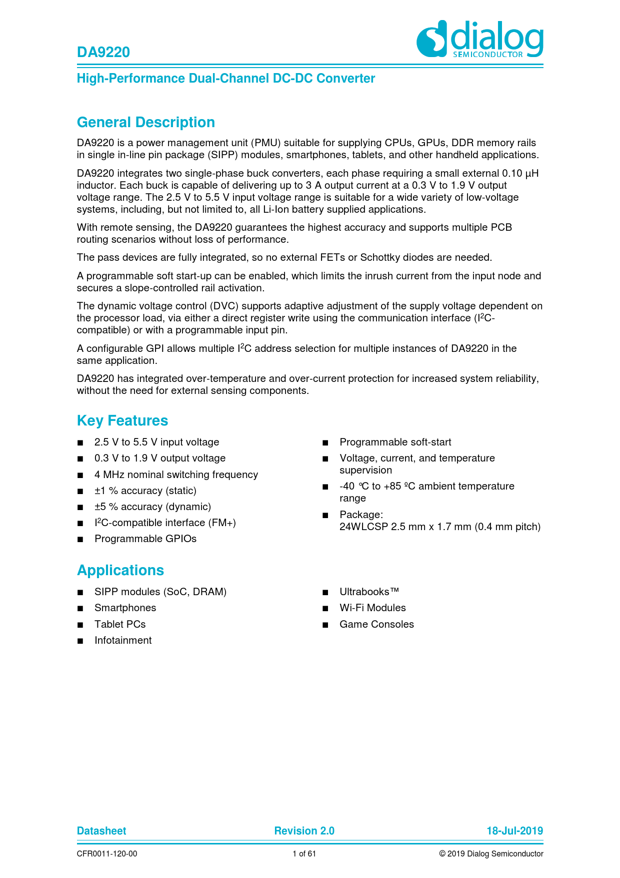 DA9220. High-Performance Dual-Channel DC-DC Converter. General Description. Key Features. Applications. Datasheet. Revision 2.0
