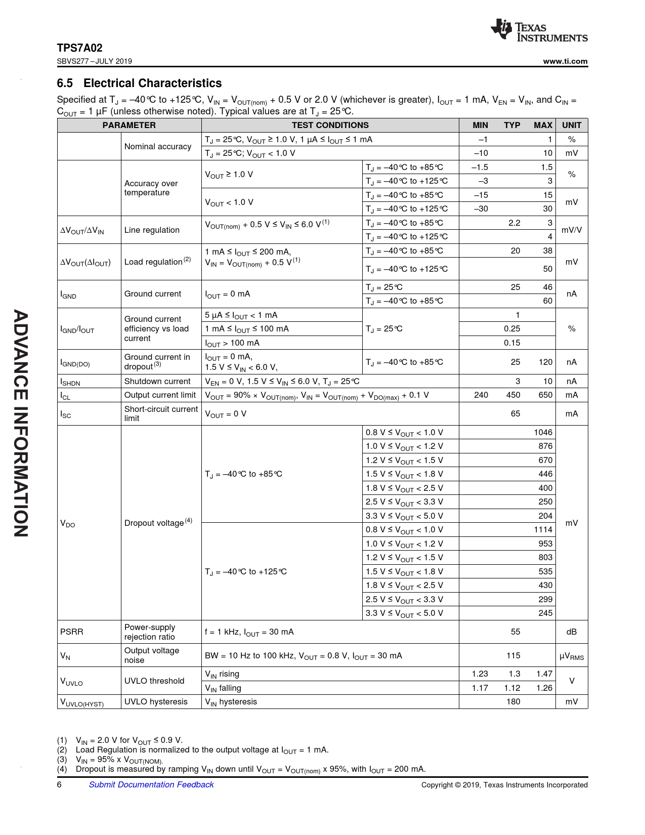 TPS7A02. www.ti.com. 6.5 Electrical Characteristics. PARAMETER. TEST CONDITIONS. MIN. TYP. MAX. UNIT. ADV. ANCEINFORMA. TION
