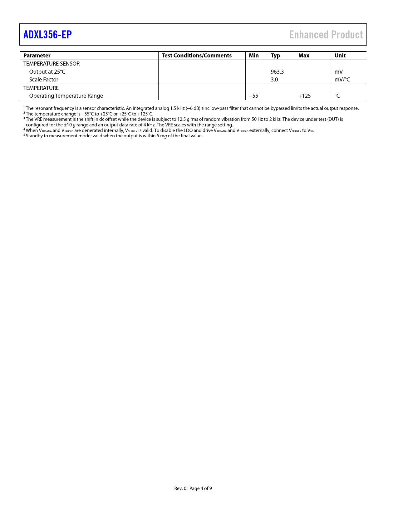 ADXL356-EPEnhanced ProductParameterTest Conditions/CommentsMinTypMaxUnit TEMPERATURE SENSOR Output at 25°C 963.3 mV Scale Factor 3.0 mV/°C TEMPERATURE Operating Temperature Range −55 +125 °C 1 The resonant frequency is a sensor characteristic. An integrated analog 1.5 kHz (−6 dB) sinc low-pass filter that cannot be bypassed limits the actual output response. 2 The temperature change is −55°C to +25°C or +25°C to +125°C. 3 The VRE measurement is the shift in dc offset while the device is subject to 12.5 g rms of random vibration from 50 Hz to 2 kHz. The device under test (DUT) is configured for the ±10 g range and an output data rate of 4 kHz. The VRE scales with the range setting. 4 When V1P8ANA and V1P8DIG are generated internally, VSUPPLY is valid. To disable the LDO and drive V1P8ANA and V1P8DIG externally, connect VSUPPLY to VSS. 5 Standby to measurement mode; valid when the output is within 5 mg of the final value. Rev. 0 | Page 4 of 9 Document Outline FEATURES ENHANCED PRODUCT FEATURES APPLICATIONS FUNCTIONAL BLOCK DIAGRAM GENERAL DESCRIPTION TABLE OF CONTENTS REVISION HISTORY SPECIFICATIONS ABSOLUTE MAXIMUM RATINGS THERMAL RESISTANCE ESD CAUTION PIN CONFIGURATION AND FUNCTION DESCRIPTIONS TYPICAL PERFORMANCE CHARACTERISTICS OUTLINE DIMENSIONS ORDERING GUIDE