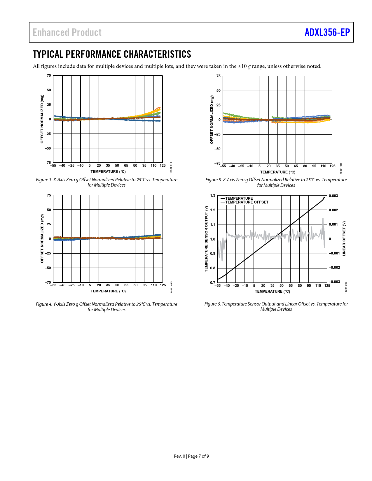 Enhanced ProductADXL356-EPTYPICAL PERFORMANCE CHARACTERISTICS All figures include data for multiple devices and multiple lots, and they were taken in the ±10 g range, unless otherwise noted. 75755050) g) gm (m (D25D25LIZELIZEAAM0M0ORORT NT NE –25E –25OFFSOFFS–50–50–75–75–55 –40 –25 –105203550658095110 125 014 –55 –40 –25 –105203550658095110 125 016 TEMPERATURE (°C) 16381- TEMPERATURE (°C) 16381- Figure 3. X-Axis Zero g Offset Normalized Relative to 25°C vs. Temperature Figure 5. Z-Axis Zero g Offset Normalized Relative to 25°C vs. Temperature for Multiple Devices for Multiple Devices 751.30.003TEMPERATURE TEMPERATURE OFFSET50(V) 1.20.002)TgmPU(T)D25U 1.10.001VOT (RELIZE ASOM01.00OFFSORRE SENAT NREEU–25T 0.9–0.001ALINOFFS–50EMPER 0.8–0.002T–75–0.0030.7–55 –40 –25 –105203550658095110 125 015 –55 –40 –25 –105203550658095110 125 050 TEMPERATURE (°C) 16381- TEMPERATURE (°C) 16381- Figure 4. Y-Axis Zero g Offset Normalized Relative to 25°C vs. Temperature Figure 6. Temperature Sensor Output and Linear Offset vs. Temperature for for Multiple Devices Multiple Devices Rev. 0 | Page 7 of 9 Document Outline FEATURES ENHANCED PRODUCT FEATURES APPLICATIONS FUNCTIONAL BLOCK DIAGRAM GENERAL DESCRIPTION TABLE OF CONTENTS REVISION HISTORY SPECIFICATIONS ABSOLUTE MAXIMUM RATINGS THERMAL RESISTANCE ESD CAUTION PIN CONFIGURATION AND FUNCTION DESCRIPTIONS TYPICAL PERFORMANCE CHARACTERISTICS OUTLINE DIMENSIONS ORDERING GUIDE