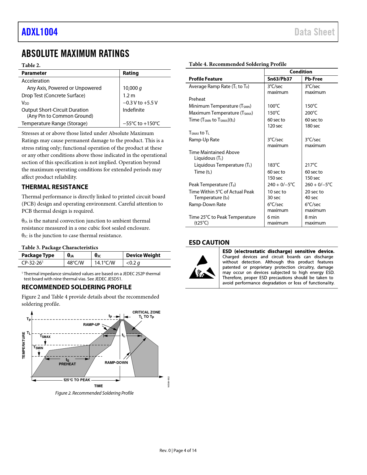 link to page 4 link to page 4 ADXL1004Data SheetABSOLUTE MAXIMUM RATINGS Table 2.Table 4. Recommended Soldering ProfileParameterRatingCondition Acceleration Profile FeatureSn63/Pb37Pb-Free Any Axis, Powered or Unpowered 10,000 g Average Ramp Rate (TL to TP) 3°C/sec 3°C/sec maximum maximum Drop Test (Concrete Surface) 1.2 m Preheat VDD −0.3 V to +5.5 V Minimum Temperature (TSMIN) 100°C 150°C Output Short-Circuit Duration Indefinite Maximum Temperature (T (Any Pin to Common Ground) SMAX) 150°C 200°C Time (T 60 sec to Temperature Range (Storage) −55°C to +150°C SMIN to TSMAX)(tS) 60 sec to 120 sec 180 sec Stresses at or above those listed under Absolute Maximum TSMAX to TL Ratings may cause permanent damage to the product. This is a Ramp-Up Rate 3°C/sec 3°C/sec stress rating only; functional operation of the product at these maximum maximum or any other conditions above those indicated in the operational Time Maintained Above Liquidous (T section of this specification is not implied. Operation beyond L) Liquidous Temperature (TL) 183°C 217°C the maximum operating conditions for extended periods may Time (tL) 60 sec to 60 sec to affect product reliability. 150 sec 150 sec THERMAL RESISTANCE Peak Temperature (TP) 240 + 0/−5°C 260 + 0/−5°C Time Within 5°C of Actual Peak 10 sec to 20 sec to Thermal performance is directly linked to printed circuit board Temperature (tP) 30 sec 40 sec (PCB) design and operating environment. Careful attention to Ramp-Down Rate 6°C/sec 6°C/sec PCB thermal design is required. maximum maximum Time 25°C to Peak Temperature 6 min 8 min θJA is the natural convection junction to ambient thermal (t25°C) maximum maximum resistance measured in a one cubic foot sealed enclosure. θ JC is the junction to case thermal resistance. ESD CAUTIONTable 3. Package Characteristics Package TypeθJAθJCDevice Weight CP-32-261 48°C/W 14.1°C/W <0.2 g 1 Thermal impedance simulated values are based on a JEDEC 2S2P thermal test board with nine thermal vias. See JEDEC JESD51. RECOMMENDED SOLDERING PROFILE Figure 2 and Table 4 provide details about the recommended soldering profile. CRITICAL ZONEtPTL TO TPTPRAMP-UPTLTtLURESMAXRAT ETSMINP ME TtSPREHEATRAMP-DOWNt25°C TO PEAK 002 TIME 16508- Figure 2. Recommended Soldering Profile Rev. 0 | Page 4 of 14 Document Outline Features Applications Functional Block Diagram General Description Revision History Specifications Absolute Maximum Ratings Thermal Resistance Recommended Soldering Profile ESD Caution Pin Configuration and Function Descriptions Typical Performance Characteristics Theory of Operation Mechanical Device Operation Operating Modes Measurement Mode Standby Mode Bandwidth Applications Information Application Circuit On Demand Self Test Ratiometric Output Voltage Interfacing Analog Output Below 10 kHz Interfacing Analog Output Beyond 10 kHz Overrange Mechanical Considerations for Mounting Layout and Design Recommendations Outline Dimensions Ordering Guide Untitled