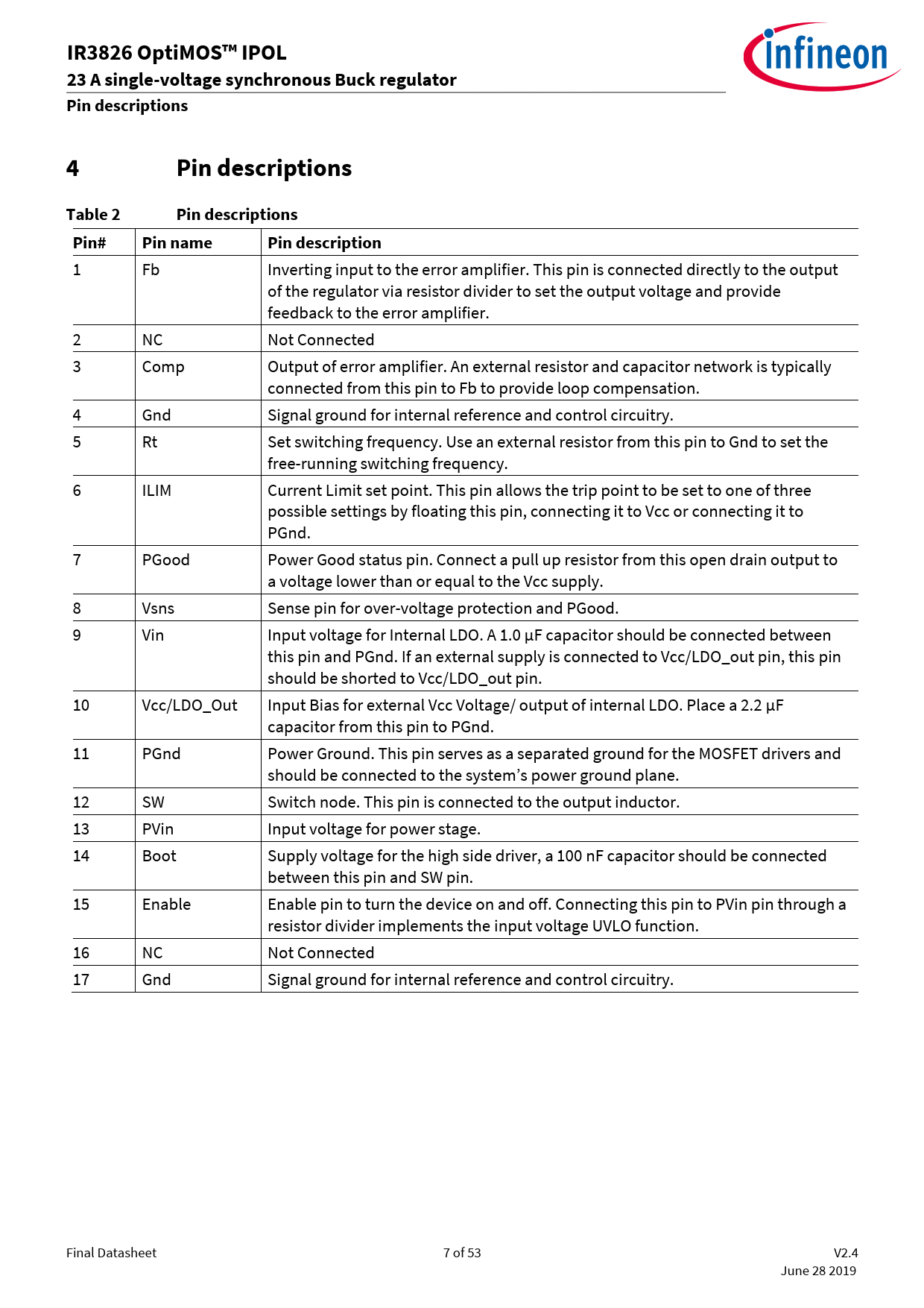 IR 8OptiMOS™ IPOL23 A single-voltage synchronous Buck regulatorPin descriptions4Pin descriptionsTable 2Pin descriptionsPin#Pin namePin description 1 Fb Inverting input to the error amplifier. This pin is connected directly to the output of the regulator via resistor divider to set the output voltage and provide feedback to the error amplifier. 2 NC Not Connected 3 Comp Output of error amplifier. An external resistor and capacitor network is typically connected from this pin to Fb to provide loop compensation. 4 Gnd Signal ground for internal reference and control circuitry. 5 Rt Set switching frequency. Use an external resistor from this pin to Gnd to set the free-running switching frequency. 6 ILIM Current Limit set point. This pin allows the trip point to be set to one of three possible settings by floating this pin, connecting it to Vcc or connecting it to PGnd. 7 PGood Power Good status pin. Connect a pull up resistor from this open drain output to a voltage lower than or equal to the Vcc supply. 8 Vsns Sense pin for over-voltage protection and PGood. 9 Vin Input voltage for Internal LDO. A 1.0 µF capacitor should be connected between this pin and PGnd. If an external supply is connected to Vcc/LDO_out pin, this pin should be shorted to Vcc/LDO_out pin. 10 Vcc/LDO_Out Input Bias for external Vcc Voltage/ output of internal LDO. Place a 2.2 µF capacitor from this pin to PGnd. 11 PGnd Power Ground. This pin serves as a separated ground for the MOSFET drivers and should be connected to the system’s power ground plane. 12 SW Switch node. This pin is connected to the output inductor. 13 PVin Input voltage for power stage. 14 Boot Supply voltage for the high side driver, a 100 nF capacitor should be connected between this pin and SW pin. 15 Enable Enable pin to turn the device on and off. Connecting this pin to PVin pin through a resistor divider implements the input voltage UVLO function. 16 NC Not Connected 17 Gnd Signal ground for internal reference and control circuitry. Final Datasheet 7 of 53 V2.4 June 28 2019 Document Outline Revision History Trademarks Disclaimer