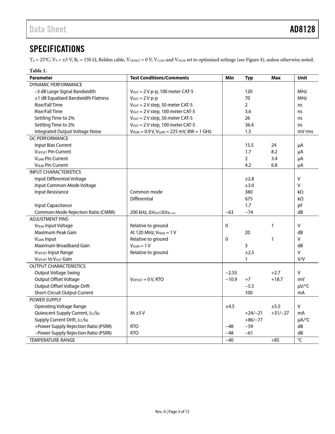 link to page 6 Data SheetAD8128SPECIFICATIONS TA = 25°C, VS = ±5 V, RL = 150 Ω, Belden cable, VOFFSET = 0 V, VGAIN and VPEAK set to optimized settings (see Figure 4), unless otherwise noted. Table 1. ParameterTest Conditions/CommentsMinTypMaxUnit DYNAMIC PERFORMANCE –3 dB Large Signal Bandwidth VOUT = 2 V p-p, 100 meter CAT-5 120 MHz ±1 dB Equalized Bandwidth Flatness VOUT = 2 V p-p 70 MHz Rise/Fall Time VOUT = 2 V step, 50 meter CAT-5 2 ns Rise/Fall Time VOUT = 2 V step, 100 meter CAT-5 3.6 ns Settling Time to 2% VOUT = 2 V step, 50 meter CAT-5 26 ns Settling Time to 2% VOUT = 2 V step, 100 meter CAT-5 36.4 ns Integrated Output Voltage Noise VPEAK = 0.9 V, VGAIN = 225 mV, BW = 1 GHz 1.5 mV rms DC PERFORMANCE Input Bias Current 15.5 24 µA VOFFSET Pin Current 1.7 8.2 µA VGAIN Pin Current 2 3.4 µA VPEAK Pin Current 4.2 6.8 µA INPUT CHARACTERISTICS Input Differential Voltage ±2.8 V Input Common-Mode Voltage ±3.0 V Input Resistance Common mode 380 kΩ Differential 675 kΩ Input Capacitance 1.7 pF Common-Mode Rejection Ratio (CMRR) 200 kHz, ΔVOUT/ΔVIN, cm −63 −74 dB ADJUSTMENT PINS VPEAK Input Voltage Relative to ground 0 1 V Maximum Peak Gain At 120 MHz, VPEAK = 1 V 20 dB VGAIN Input Relative to ground 0 1 V Maximum Broadband Gain VGAIN = 1 V 3 dB VOFFSET Input Range Relative to ground ±2.5 V VOFFSET to VOUT Gain 1 V/V OUTPUT CHARACTERISTICS Output Voltage Swing −2.55 +2.7 V Output Offset Voltage VOFFSET = 0 V, RTO −10.9 +7 +18.7 mV Output Offset Voltage Drift −5.5 µV/°C Short-Circuit Output Current 100 mA POWER SUPPLY Operating Voltage Range ±4.5 ±5.5 V Quiescent Supply Current, ICC/IEE At ±5 V +24/−21 +31/−27 mA Supply Current Drift, ICC/IEE +86/−77 µA/°C +Power Supply Rejection Ratio (PSRR) RTO −48 −59 dB −Power Supply Rejection Ratio (PSRR) RTO −48 −61 dB TEMPERATURE RANGE −40 +85 °C Rev. A | Page 3 of 12 Document Outline FEATURES APPLICATIONS FUNCTIONAL BLOCK DIAGRAM GENERAL DESCRIPTION REVISION HISTORY SPECIFICATIONS ABSOLUTE MAXIMUM RATINGS THERMAL RESISTANCE Maximum Power Dissipation ESD CAUTION PIN CONFIGURATION AND FUNCTION DESCRIPTIONS TYPICAL PERFORMANCE CHARACTERISTICS TEST CIRCUIT THEORY OF OPERATION INPUT COMMON-MODE VOLTAGE RANGE CONSIDERATIONS APPLICATIONS INFORMATION KVM APPLICATIONS DC CONTROL PINS CASCADED APPLICATIONS EXPOSED PAD (EP) LAYOUT AND POWER SUPPLY DECOUPLING CONSIDERATIONS EVALUATION BOARDS OUTLINE DIMENSIONS ORDERING GUIDE