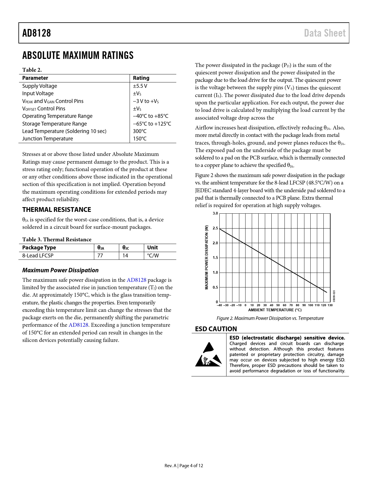 AD8128. Data Sheet. ABSOLUTE MAXIMUM RATINGS. Table 2. Parameter. Rating. THERMAL RESISTANCE. 3.0. (W) 2.5. Table 3. Thermal Resistance