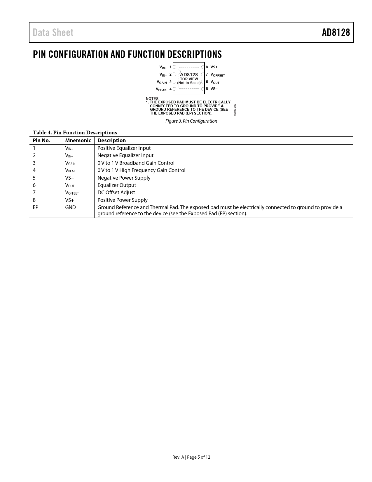 link to page 11 Data SheetAD8128PIN CONFIGURATION AND FUNCTION DESCRIPTIONSVIN+ 18 VS+VIN– 2AD81287 VOFFSETTOP VIEWVGAIN 36 V(Not to Scale)OUTVPEAK 45 VS–NOTES1. THE EXPOSED PAD MUST BE ELECTRICALLYCONNECTED TO GROUND TO PROVIDE A 002 GROUND REFERENCE TO THE DEVICE (SEETHE EXPOSED PAD (EP) SECTION). 05699- Figure 3. Pin Configuration Table 4. Pin Function Descriptions Pin No.Mnemonic Description 1 VIN+ Positive Equalizer Input 2 VIN− Negative Equalizer Input 3 VGAIN 0 V to 1 V Broadband Gain Control 4 VPEAK 0 V to 1 V High Frequency Gain Control 5 VS− Negative Power Supply 6 VOUT Equalizer Output 7 VOFFSET DC Offset Adjust 8 VS+ Positive Power Supply EP GND Ground Reference and Thermal Pad. The exposed pad must be electrically connected to ground to provide a ground reference to the device (see the Exposed Pad (EP) section). Rev. A | Page 5 of 12 Document Outline FEATURES APPLICATIONS FUNCTIONAL BLOCK DIAGRAM GENERAL DESCRIPTION REVISION HISTORY SPECIFICATIONS ABSOLUTE MAXIMUM RATINGS THERMAL RESISTANCE Maximum Power Dissipation ESD CAUTION PIN CONFIGURATION AND FUNCTION DESCRIPTIONS TYPICAL PERFORMANCE CHARACTERISTICS TEST CIRCUIT THEORY OF OPERATION INPUT COMMON-MODE VOLTAGE RANGE CONSIDERATIONS APPLICATIONS INFORMATION KVM APPLICATIONS DC CONTROL PINS CASCADED APPLICATIONS EXPOSED PAD (EP) LAYOUT AND POWER SUPPLY DECOUPLING CONSIDERATIONS EVALUATION BOARDS OUTLINE DIMENSIONS ORDERING GUIDE