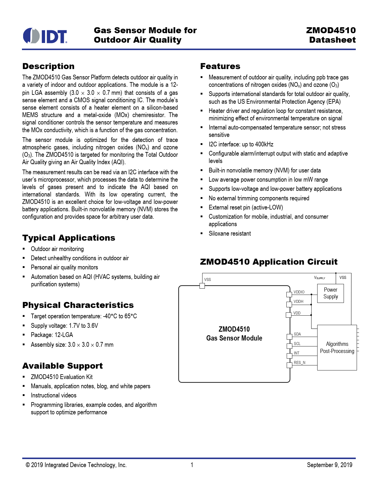ZMOD4510 Evaluation Kit Manuals, application notes, blog, and white papers Instructional videos Programming libraries, example codes, and algorithm support to optimize performance © 2019 Integrated Device Technology, Inc. 1 September 9, 2019 Document Outline 1. Pin Assignments 2. Pin Descriptions 3. Absolute Maximum Ratings 4. Operating Conditions 5. Electrical Characteristics 6. Block Diagram 7. Sensor Module Characteristics 7.1 Gas Sensor Module Characteristics 7.2 Internal Temperature Sensor Characteristics 8. Gas Sensor Module Characteristics 8.1 Typical Gas Stimulation 8.2 Environmental Temperature and Humidity 8.3 Accuracy and Conditioning 9. Assembly Restrictions, Operation, Integration Notes, and Storage 10. Test and Calibration 11. I2C Interface and Data Transmission Protocol 12. Related Websites and Software 13. Glossary 14. Package Outline Drawings 15. Marking Diagram 16. Ordering Information 17. Revision History