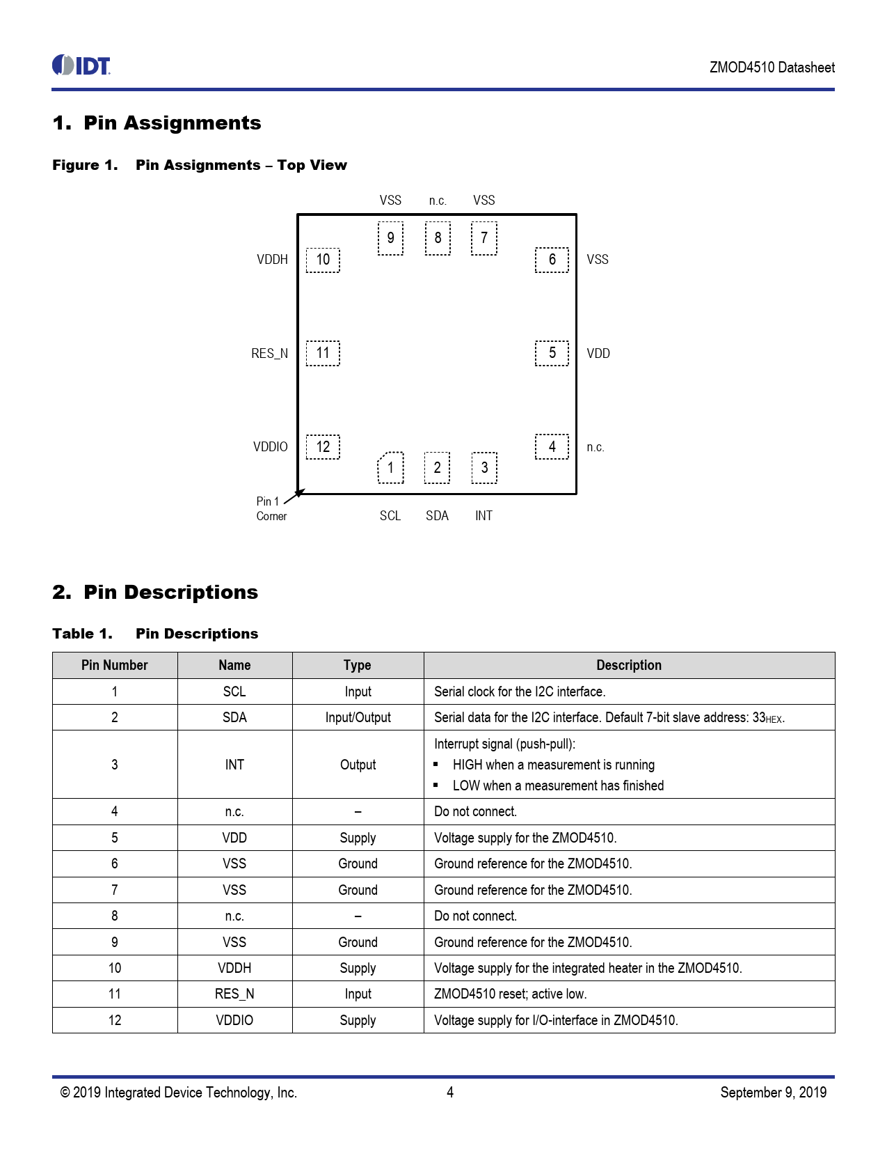 1 SCL Input Serial clock for the I2C interface. 2 SDA Input/Output Serial data for the I2C interface. Default 7-bit slave address: 33HEX. Interrupt signal (push-pull): 3 INT Output HIGH when a measurement is running LOW when a measurement has finished 4 n.c. – Do not connect. 5 VDD Supply Voltage supply for the ZMOD4510. 6 VSS Ground Ground reference for the ZMOD4510. 7 VSS Ground Ground reference for the ZMOD4510. 8 n.c. – Do not connect. 9 VSS Ground Ground reference for the ZMOD4510. 10 VDDH Supply Voltage supply for the integrated heater in the ZMOD4510. 11 RES_N Input ZMOD4510 reset; active low. 12 VDDIO Supply Voltage supply for I/O-interface in ZMOD4510. © 2019 Integrated Device Technology, Inc. 4 September 9, 2019 Document Outline 1. Pin Assignments 2. Pin Descriptions 3. Absolute Maximum Ratings 4. Operating Conditions 5. Electrical Characteristics 6. Block Diagram 7. Sensor Module Characteristics 7.1 Gas Sensor Module Characteristics 7.2 Internal Temperature Sensor Characteristics 8. Gas Sensor Module Characteristics 8.1 Typical Gas Stimulation 8.2 Environmental Temperature and Humidity 8.3 Accuracy and Conditioning 9. Assembly Restrictions, Operation, Integration Notes, and Storage 10. Test and Calibration 11. I2C Interface and Data Transmission Protocol 12. Related Websites and Software 13. Glossary 14. Package Outline Drawings 15. Marking Diagram 16. Ordering Information 17. Revision History