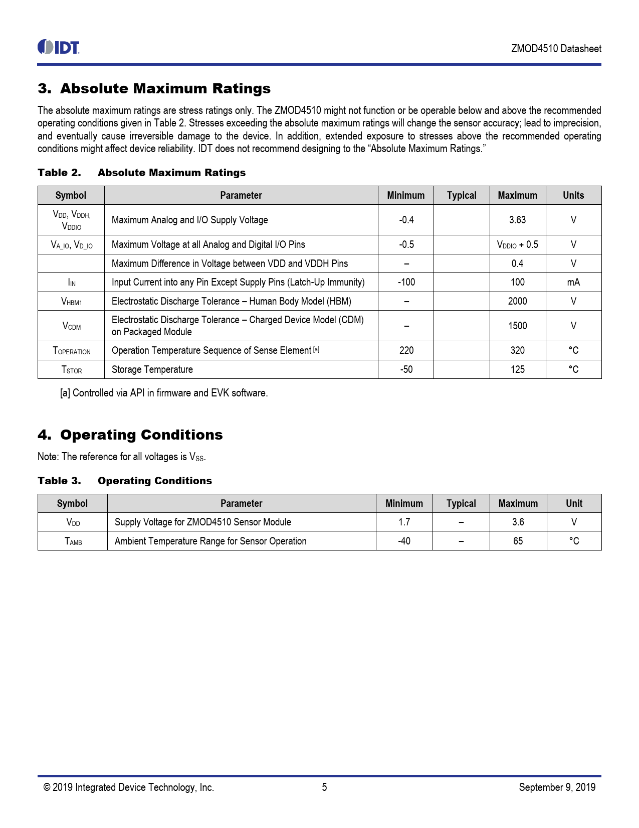 The absolute maximum ratings are stress ratings only. The ZMOD4510 might not function or be operable below and above the recommended operating conditions given in Table 2. Stresses exceeding the absolute maximum ratings will change the sensor accuracy; lead to imprecision, and eventually cause irreversible damage to the device. In addition, extended exposure to stresses above the recommended operating conditions might affect device reliability. IDT does not recommend designing to the “Absolute Maximum Ratings.”