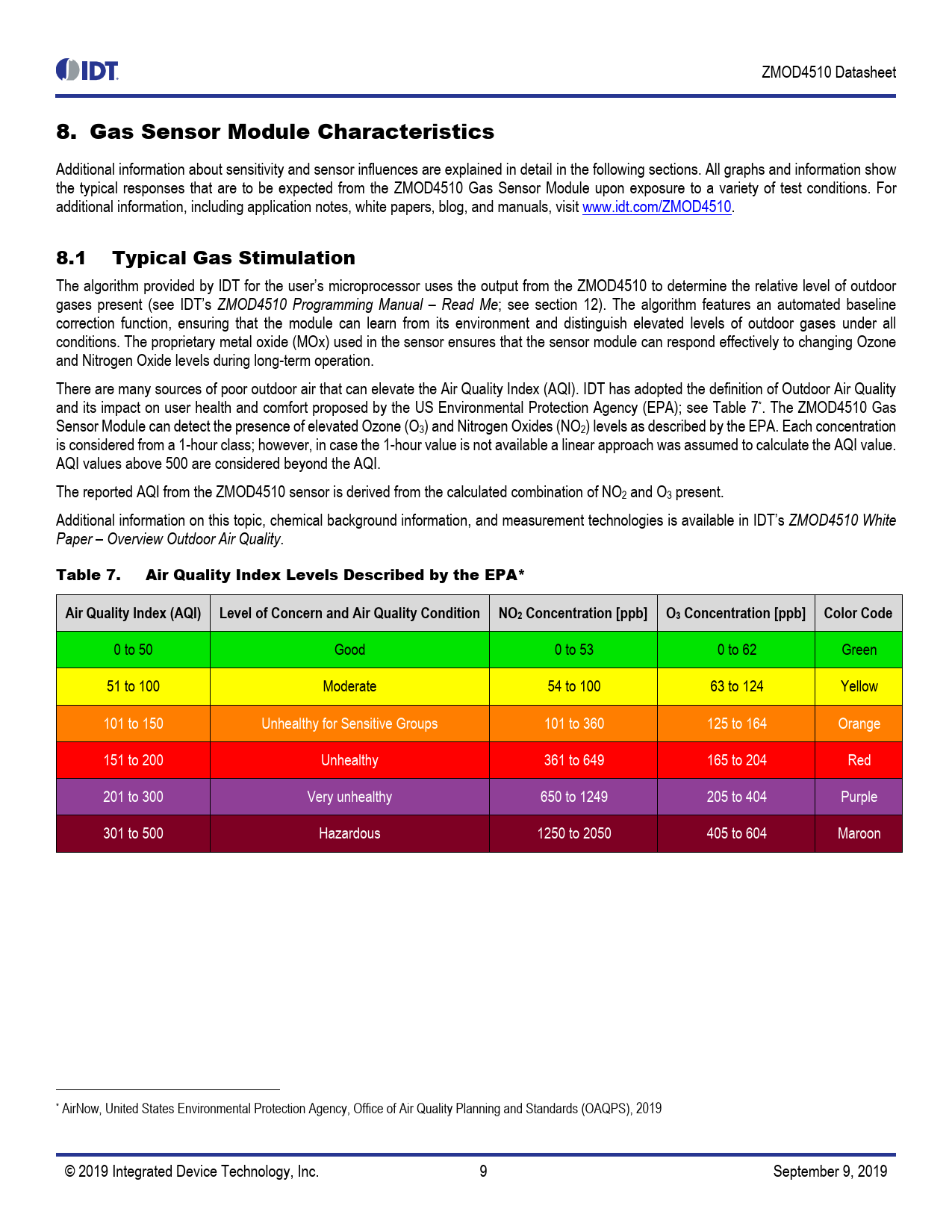 The algorithm provided by IDT for the user’s microprocessor uses the output from the ZMOD4510 to determine the relative level of outdoor gases present (see IDT’s ZMOD4510 Programming Manual – Read Me; see section 12). The algorithm features an automated baseline correction function, ensuring that the module can learn from its environment and distinguish elevated levels of outdoor gases under all conditions. The proprietary metal oxide (MOx) used in the sensor ensures that the sensor module can respond effectively to changing Ozone and Nitrogen Oxide levels during long-term operation. There are many sources of poor outdoor air that can elevate the Air Quality Index (AQI). IDT has adopted the definition of Outdoor Air Quality and its impact on user health and comfort proposed by the US Environmental Protection Agency (EPA); see Table 7*. The ZMOD4510 Gas Sensor Module can detect the presence of elevated Ozone (O3) and Nitrogen Oxides (NO2) levels as described by the EPA. Each concentration is considered from a 1-hour class; however, in case the 1-hour value is not available a linear approach was assumed to calculate the AQI value. AQI values above 500 are considered beyond the AQI. The reported AQI from the ZMOD4510 sensor is derived from the calculated combination of NO2 and O3 present. Additional information on this topic, chemical background information, and measurement technologies is available in IDT’s ZMOD4510 White Paper – Overview Outdoor Air Quality.