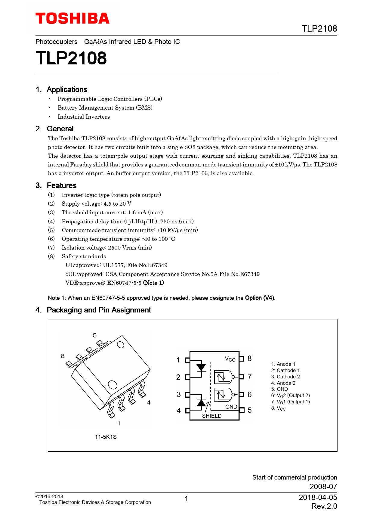 TLP2108. Photocouplers. GaAℓAs. Infrared. LED. &. Photo. IC. TLP2108. 1. Applications. •. Programmable. Logic. Controllers. (PLCs). •. Battery