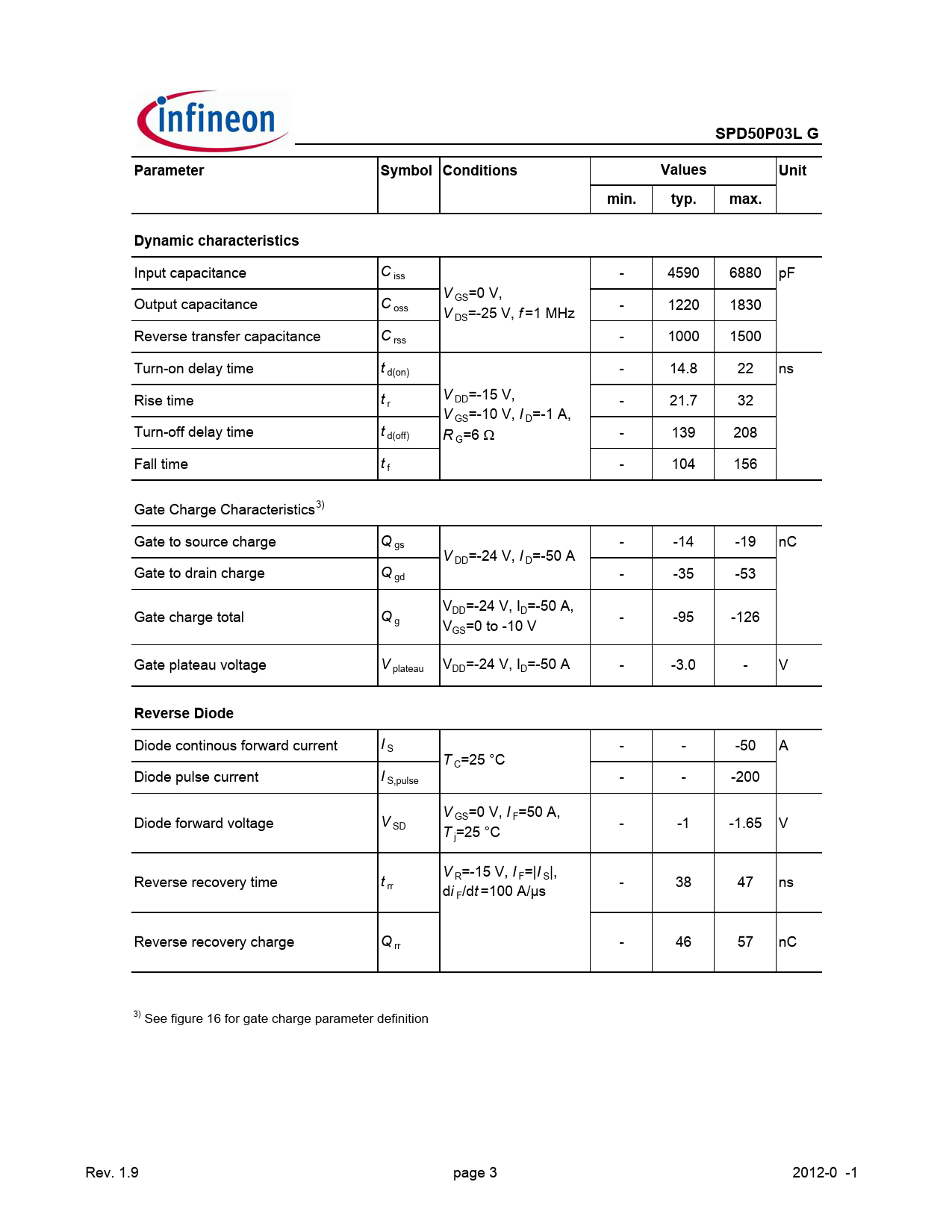 Pages / Page9 / 3 — SPD50P03L G. Parameter. Symbol Conditions. Values. Unit. min. typ. max. …