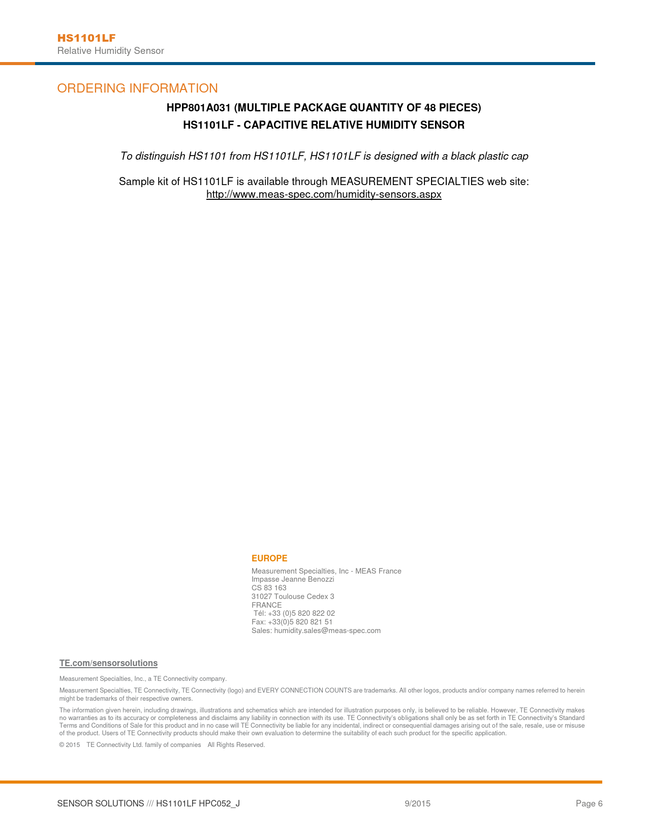 Measurement Specialties, Inc., a TE Connectivity company. Measurement Specialties, TE Connectivity, TE Connectivity (logo) and EVERY CONNECTION COUNTS are trademarks. All other logos, products and/or company names referred to herein might be trademarks of their respective owners. The information given herein, including drawings, illustrations and schematics which are intended for illustration purposes only, is believed to be reliable. However, TE Connectivity makes no warranties as to its accuracy or completeness and disclaims any liability in connection with its use. TE Connectivity‘s obligations shall only be as set forth in TE Connectivity‘s Standard Terms and Conditions of Sale for this product and in no case will TE Connectivity be liable for any incidental, indirect or consequential damages arising out of the sale, resale, use or misuse of the product. Users of TE Connectivity products should make their own evaluation to determine the suitability of each such product for the specific application. © 2015 TE Connectivity Ltd. family of companies All Rights Reserved. SENSOR SOLUTIONS /// HS1101LF HPC052_J 9/2015 Page 6 Document Outline HS1101LF Relative Humidity Sensor