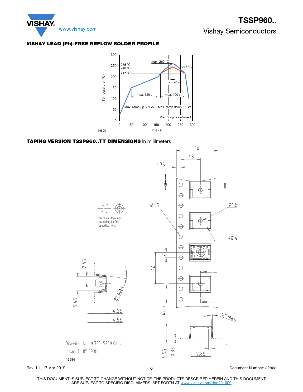TSSP960.. www.vishay.com Vishay Semiconductors VISHAY LEAD (Pb)-FREE REFLOW SOLDER PROFILE Axis Title 300 10000 max. 260 °C 250 255 °C 245 °C 240 °C 217 °C 200 1000 max. 20 s ine 150 2nd l max. 120 s max. 100 s 100 100 Temperature (°C) Max. ramp up 3 °C/s Max. ramp down 6 °C/s 50 Max. 2 cycles allowed 0 10 0 50 100 150 200 250 300 19800 Time (s) TAPING VERSION TSSP960..TT DIMENSIONS in millimeters 16584 Rev. 1.1, 17-Apr-2019 6 Document Number: 82868 THIS DOCUMENT IS SUBJECT TO CHANGE WITHOUT NOTICE. THE PRODUCTS DESCRIBED HEREIN AND THIS DOCUMENT ARE SUBJECT TO SPECIFIC DISCLAIMERS, SET FORTH AT www.vishay.com/doc?91000