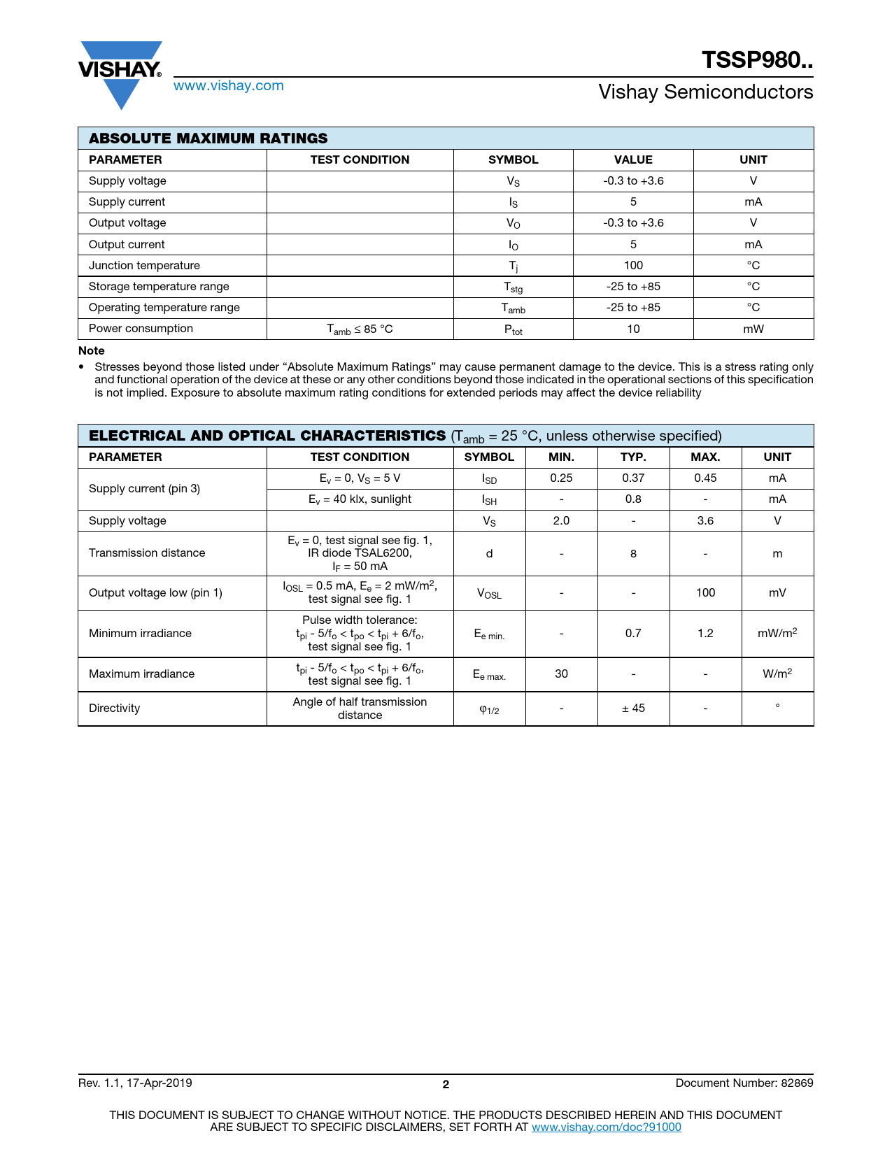 TSSP980.. www.vishay.com Vishay Semiconductors ABSOLUTE MAXIMUM RATINGS PARAMETERTEST CONDITIONSYMBOLVALUEUNIT Supply voltage VS -0.3 to +3.6 V Supply current IS 5 mA Output voltage VO -0.3 to +3.6 V Output current IO 5 mA Junction temperature Tj 100 °C Storage temperature range Tstg -25 to +85 °C Operating temperature range Tamb -25 to +85 °C Power consumption Tamb ≤ 85 °C Ptot 10 mW Note • Stresses beyond those listed under “Absolute Maximum Ratings” may cause permanent damage to the device. This is a stress rating only and functional operation of the device at these or any other conditions beyond those indicated in the operational sections of this specification is not implied. Exposure to absolute maximum rating conditions for extended periods may affect the device reliability ELECTRICAL AND OPTICAL CHARACTERISTICS (Tamb = 25 °C, unless otherwise specified) PARAMETERTEST CONDITIONSYMBOLMIN.TYP.MAX.UNIT Ev = 0, VS = 5 V ISD 0.25 0.37 0.45 mA Supply current (pin 3) Ev = 40 klx, sunlight ISH - 0.8 - mA Supply voltage VS 2.0 - 3.6 V Ev = 0, test signal see fig. 1, Transmission distance IR diode TSAL6200, d - 8 - m IF = 50 mA I Output voltage low (pin 1) OSL = 0.5 mA, Ee = 2 mW/m2, V test signal see fig. 1 OSL - - 100 mV Pulse width tolerance: Minimum irradiance tpi - 5/fo < tpo < tpi + 6/fo, Ee min. - 0.7 1.2 mW/m2 test signal see fig. 1 t Maximum irradiance pi - 5/fo < tpo < tpi + 6/fo, E test signal see fig. 1 e max. 30 - - W/m2 Angle of half transmission Directivity ϕ 45 - ° distance 1/2 - ± Rev. 1.1, 17-Apr-2019 2 Document Number: 82869 THIS DOCUMENT IS SUBJECT TO CHANGE WITHOUT NOTICE. THE PRODUCTS DESCRIBED HEREIN AND THIS DOCUMENT ARE SUBJECT TO SPECIFIC DISCLAIMERS, SET FORTH AT www.vishay.com/doc?91000