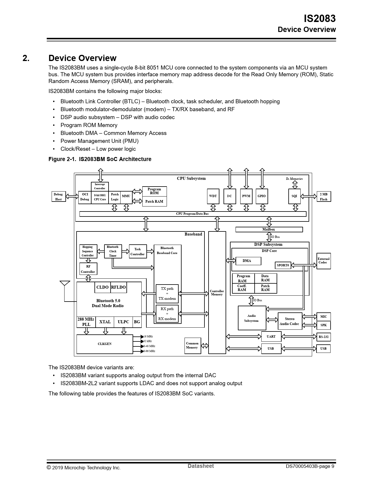 0-96 MHz The IS2083BM device variants are: • IS2083BM variant supports analog output from the internal DAC • IS2083BM-2L2 variant supports LDAC and does not support analog output The following table provides the features of IS2083BM SoC variants. © 2019 Microchip Technology Inc.