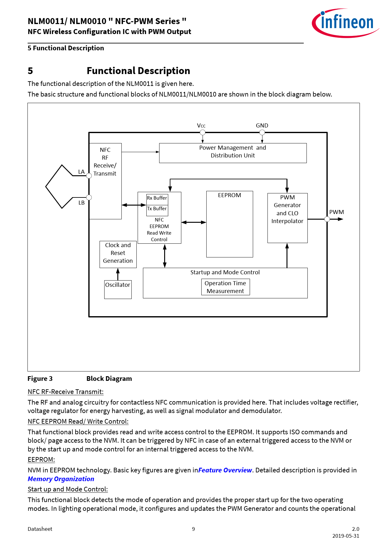 The functional description of the NLM0011 is given here. The basic structure and functional blocks of NLM0011/NLM0010 are shown in the block diagram below. VCC GND Power Management and NFC Distribution Unit RF Receive/ LA Transmit EEPROM Rx Buffer PWM LB Generator Tx Buffer and CLO PWM NFC Interpolator EEPROM Read Write Control Clock and Reset Generation Startup and Mode Control Oscillator Operation Time Measurement