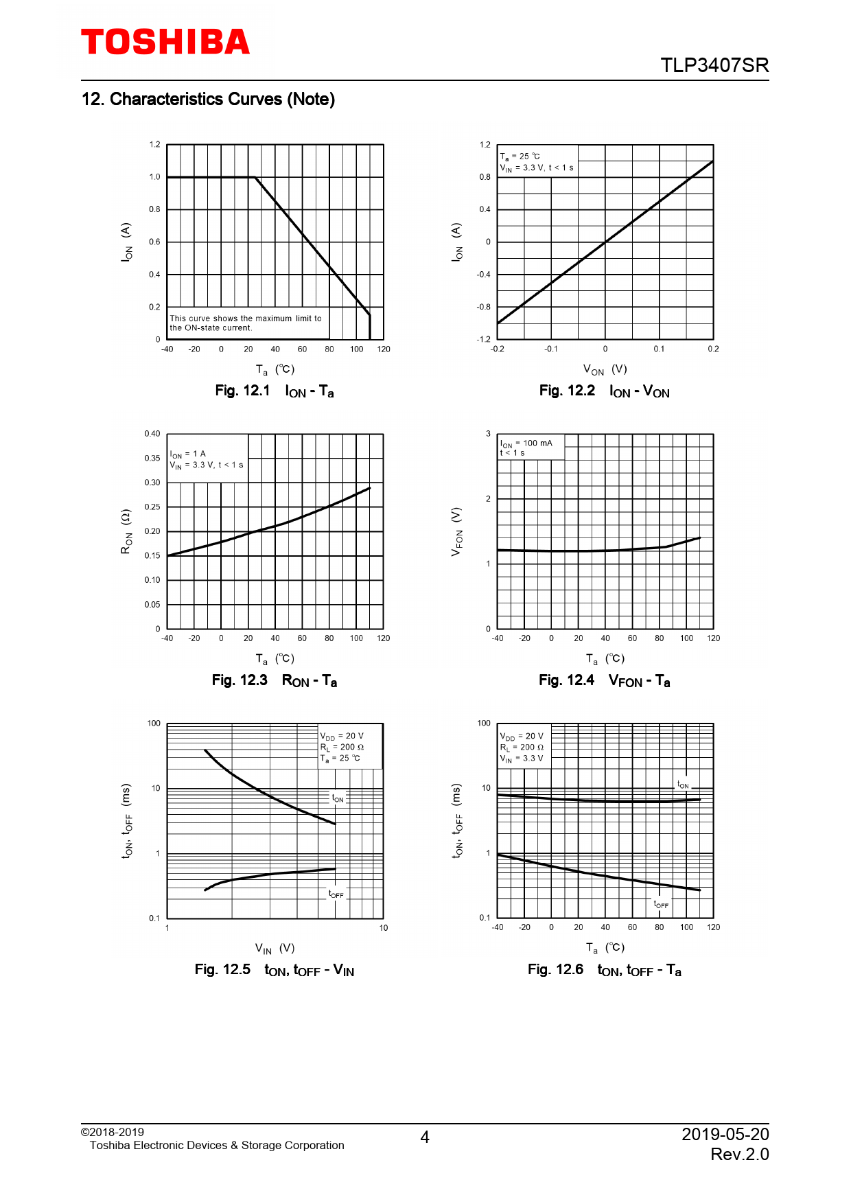 TLP3407SR. 12. Characteristics. Curves. (Note). Fig. 12.1. ION. -. Ta. Fig. 12.2. ION. -. VON. Fig. 12.3. RON. -. Ta. Fig. 12.4. VFON. -. Ta. Fig. 12.5. tON,. tOFF. -. VIN. Fig. 12.6