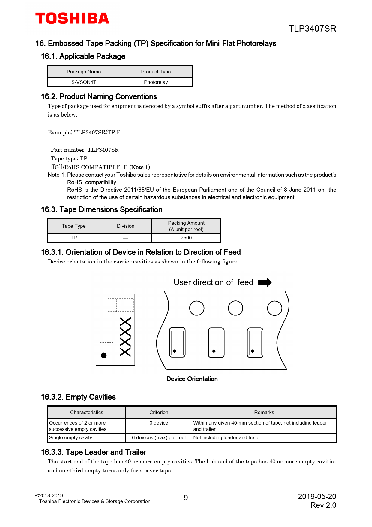 | Pages / Page | 14 / 9 — TLP3407SR. 16. Embossed-Tape. Packing. (TP). Specification. for. … |