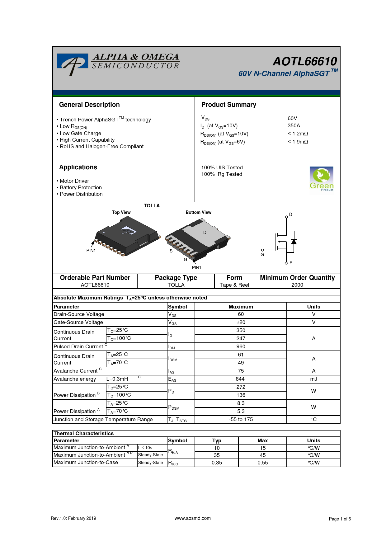 AOTL6661060V N-Channel AlphaSGT TMGeneral DescriptionProduct Summary VDS 60V • Trench Power AlphaSGTTM technology • Low R I DS(ON) D (at VGS=10V) 350A • Low Gate Charge RDS(ON) (at VGS=10V) < 1.2mΩ • High Current Capability RDS(ON) (at VGS=6V) < 1.9mΩ • RoHS and Halogen-Free Compliant Applications 100% UIS Tested 100% Rg Tested • Motor Driver • Battery Protection • Power Distribution TOLLATop ViewBottom View D D PIN1 S G G S PIN1 Orderable Part NumberPackage TypeFormMinimum Order Quantity AOTL66610 TOLLA Tape & Reel 2000 Absolute Maximum Ratings TA=25°C unless otherwise notedParameterSymbolMaximumUnits Drain-Source Voltage VDS 60 V Gate-Source Voltage VGS ±20 V TC=25°C 350 Continuous Drain ID Current TC=100°C 247 A Pulsed Drain Current C IDM 960 TA=25°C Continuous Drain 61 IDSM A Current TA=70°C 49 Avalanche Current C IAS 75 A Avalanche energy L=0.3mH C EAS 844 mJ TC=25°C 272 PD W Power Dissipation B TC=100°C 136 TA=25°C 8.3 PDSM W Power Dissipation A TA=70°C 5.3 Junction and Storage Temperature Range TJ, TSTG -55 to 175 °C Thermal Characteristics ParameterSymbolTypMaxUnits Maximum Junction-to-Ambient A t ≤ 10s 10 15 °C/W Rq Maximum Junction-to-Ambient A D JA Steady-State 35 45 °C/W Maximum Junction-to-Case Steady-State RqJC 0.35 0.55 °C/W Rev.1.0: February 2019 www.aosmd.com Page 1 of 6