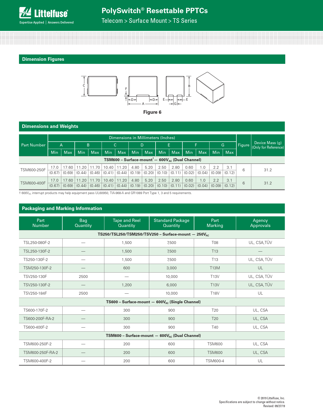 TSM600-250F-2 — 200 600 TSM600 UL, CSA TSM600-250F-RA-2 — 200 600 TSM600 UL, CSA TSM600-400F-2 — 200 600 TSM600-4 UL © 2019 Littelfuse, Inc. Specifications are subject to change without notice. Revised: 09/27/19