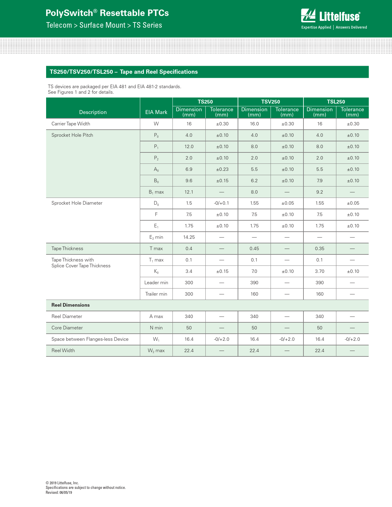 PolySwitch® Resettable PTCs. TS250/TSV250/TSL250 – Tape and Reel Specifications. TS250. TSV250. TSL250. Reel Dimensions