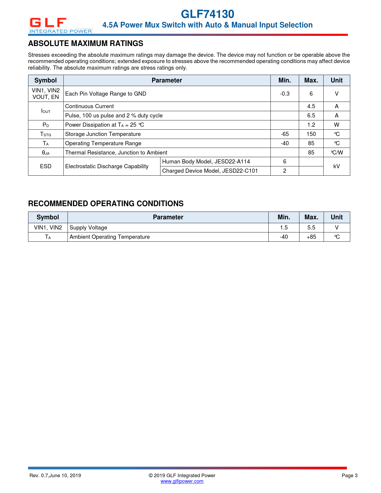 GLF74130. 4.5A Power Mux Switch with Auto & Manual Input Selection. ABSOLUTE MAXIMUM RATINGS. Symbol. Parameter. Min. Max. Unit