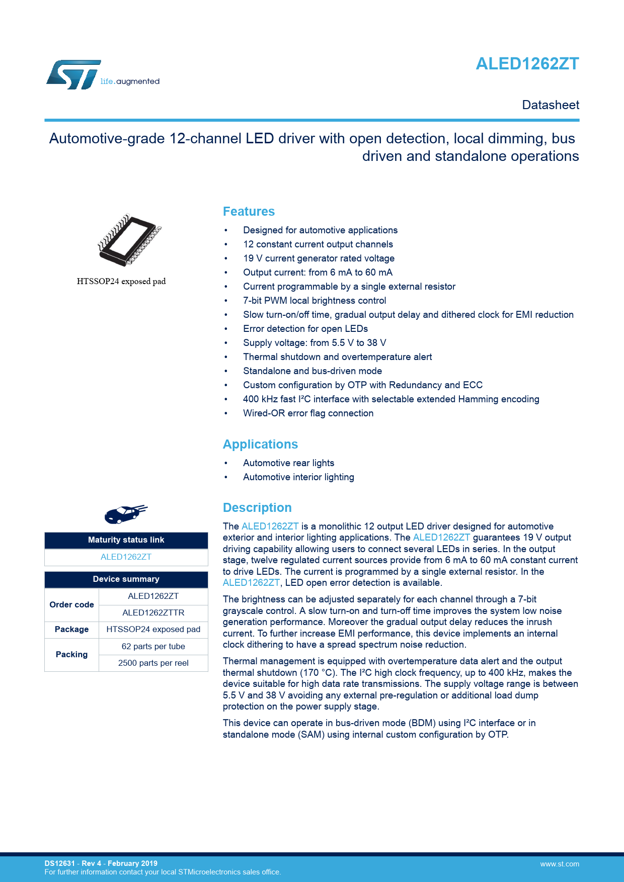 Pages / Page69 / 1 — ALED1262ZT. Features. Applications. Description. Maturity status link. …