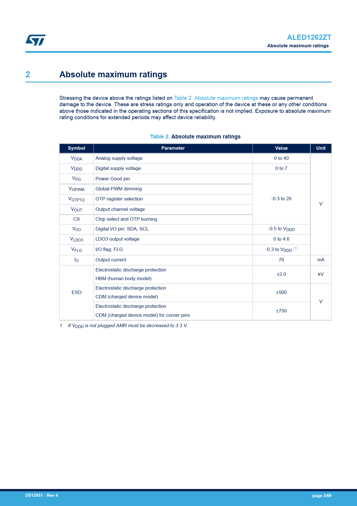 Pages / Page69 / 3 — ALED1262ZT. Absolute maximum ratings. Table 2. Absolute maximum ratings. …
