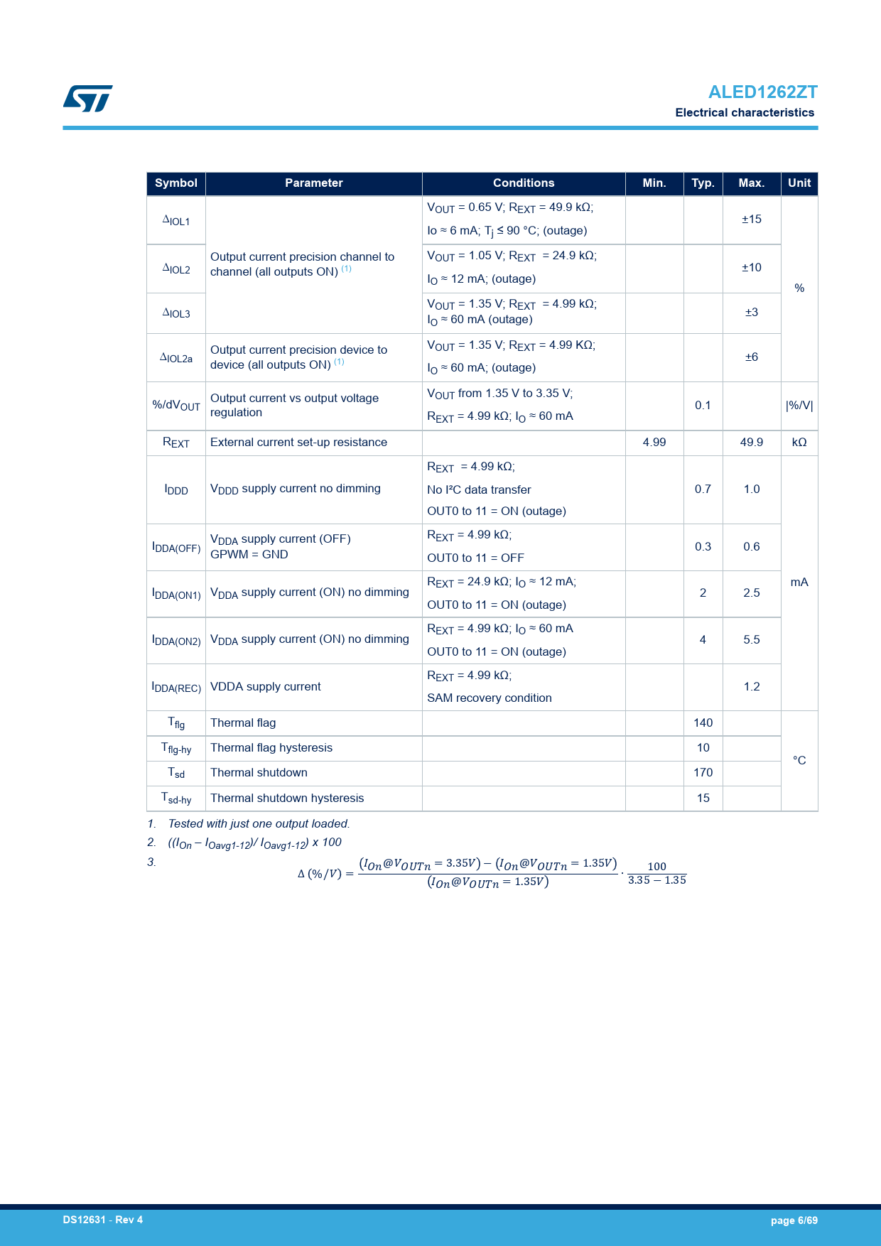 VOUT = 0.65 V; REXT = 49.9 kΩ; ∆IOL1 ±15 Io ≈ 6 mA; Tj ≤ 90 °C; (outage) Output current precision channel to VOUT = 1.05 V; REXT = 24.9 kΩ; ∆IOL2 channel (all outputs ON) (1) ±10 IO ≈ 12 mA; (outage) % V ∆ OUT = 1.35 V; REXT = 4.99 kΩ; IOL3 ±3 IO ≈ 60 mA (outage) Output current precision device to VOUT = 1.35 V; REXT = 4.99 KΩ; ∆IOL2a ±6 device (all outputs ON) (1) IO ≈ 60 mA; (outage) VOUT from 1.35 V to 3.35 V; %/dV Output current vs output voltage OUT 0.1 |%/V| regulation REXT = 4.99 kΩ; IO ≈ 60 mA REXT External current set-up resistance 4.99 49.9 kΩ REXT = 4.99 kΩ; IDDD VDDD supply current no dimming No I²C data transfer 0.7 1.0 OUT0 to 11 = ON (outage) V REXT = 4.99 kΩ; I DDA supply current (OFF) DDA(OFF) 0.3 0.6 GPWM = GND OUT0 to 11 = OFF REXT = 24.9 kΩ; IO ≈ 12 mA; mA IDDA(ON1) VDDA supply current (ON) no dimming 2 2.5 OUT0 to 11 = ON (outage) REXT = 4.99 kΩ; IO ≈ 60 mA IDDA(ON2) VDDA supply current (ON) no dimming 4 5.5 OUT0 to 11 = ON (outage) REXT = 4.99 kΩ; IDDA(REC) VDDA supply current 1.2 SAM recovery condition Tflg Thermal flag 140 Tflg-hy Thermal flag hysteresis 10 °C Tsd Thermal shutdown 170 Tsd-hy Thermal shutdown hysteresis 15 1. Tested with just one output loaded. 2. ((IOn – IOavg1-12)/ IOavg1-12) x 100 3. I ∆ %/V = On@VOUTn = 3.35V − IOn@VOUTn = 1.35V IOn@VOUTn = 1.35V ∙ 100 3.35 − 1.35