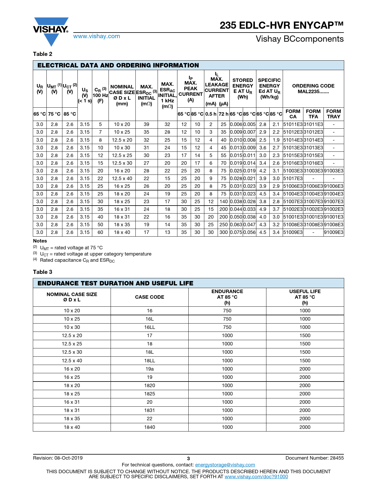 235 EDLC-HVR ENYCAP™. Table 2. ELECTRICAL DATA AND ORDERING INFORMATION. MAX. STORED. SPECIFIC. LEAKAGE. UMT (1) UCT (2). NOMINAL. ENERGY