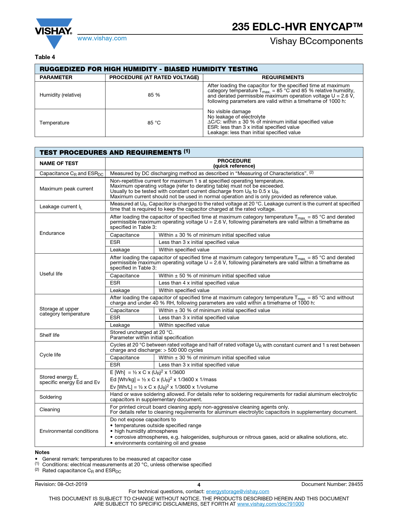235 EDLC-HVR ENYCAP™ www.vishay.com Vishay BCcomponents Table 4RUGGEDIZED FOR HIGH HUMIDITY - BIASED HUMIDITY TESTINGPARAMETERPROCEDURE (AT RATED VOLTAGE)REQUIREMENTS After loading the capacitor for the specified time at maximum category temperature Tmax. = 85 °C and 85 % relative humidity, Humidity (relative) 85 % and derated permissible maximum operation voltage U = 2.6 V, following parameters are valid within a timeframe of 1000 h: No visible damage No leakage of electrolyte Temperature 85 °C C/C: within ± 30 % of minimum initial specified value ESR: less than 3 x initial specified value Leakage: less than initial specified value TEST PROCEDURES AND REQUIREMENTS (1)PROCEDURENAME OF TEST(quick reference) Capacitance CR and ESRDC Measured by DC discharging method as described in “Measuring of Characteristics”. (2) Non-repetitive current for maximum 1 s at specified operating temperature. Maximum operating voltage (refer to derating table) must not be exceeded. Maximum peak current Usually to be tested with constant current discharge from UR to 0.5 x UR. Maximum current should not be used in normal operation and is only provided as reference value. Measured at U Leakage current I R. Capacitor is charged to the rated voltage at 20 °C. Leakage current is the current at specified L time that is required to keep the capacitor charged at the rated voltage. After loading the capacitor of specified time at maximum category temperature Tmax. = 85 °C and derated permissible maximum operating voltage U = 2.6 V, following parameters are valid within a timeframe as specified in Table 3: Endurance Capacitance Within ± 30 % of minimum initial specified value ESR Less than 3 x initial specified value Leakage Within specified value After loading the capacitor of specified time at maximum category temperature Tmax. = 85 °C and derated permissible maximum operating voltage U = 2.6 V, following parameters are valid within a timeframe as specified in Table 3: Useful life Capacitance Within ± 50 % of minimum initial specified value ESR Less than 4 x initial specified value Leakage Within specified value After loading the capacitor of specified time at maximum category temperature Tmax. = 85 °C and without charge and under 40 % RH, following parameters are valid within a timeframe of 1000 h: Storage at upper Capacitance Within ± 30 % of minimum initial specified value category temperature ESR Less than 3 x initial specified value Leakage Within specified value Stored uncharged at 20 °C. Shelf life Parameter within initial specification Cycles at 20 °C between rated voltage and half of rated voltage UR with constant current and 1 s rest between charge and discharge: > 500 000 cycles Cycle life Capacitance Within ± 30 % of minimum initial specified value ESR Less than 3 x initial specified value E [Wh] = ½ x C x (UR)2 x 1/3600 Stored energy E, Ed [Wh/kg] = ½ x C x (U specific energy Ed and Ev R)2 x 1/3600 x 1/mass Ev [Wh/L] = ½ x C x (UR)2 x 1/3600 x 1/volume Hand or wave soldering allowed. For details refer to soldering requirements for radial aluminum electrolytic Soldering capacitors in supplementary document. For printed circuit board cleaning apply non-aggressive cleaning agents only. Cleaning For details refer to cleaning requirements for aluminum electrolytic capacitors in supplementary document. Do not expose capacitors to • temperatures outside specified range Environmental conditions • high humidity atmospheres • corrosive atmospheres, e.g. halogenides, sulphurous or nitrous gases, acid or alkaline solutions, etc. • environments containing oil and grease Notes • General remark: temperatures to be measured at capacitor case (1) Conditions: electrical measurements at 20 °C, unless otherwise specified (2) Rated capacitance CR and ESRDC Revision: 08-Oct-2019 4 Document Number: 28455 For technical questions, contact: energystorage@vishay.com THIS DOCUMENT IS SUBJECT TO CHANGE WITHOUT NOTICE. THE PRODUCTS DESCRIBED HEREIN AND THIS DOCUMENT ARE SUBJECT TO SPECIFIC DISCLAIMERS, SET FORTH AT www.vishay.com/doc?91000