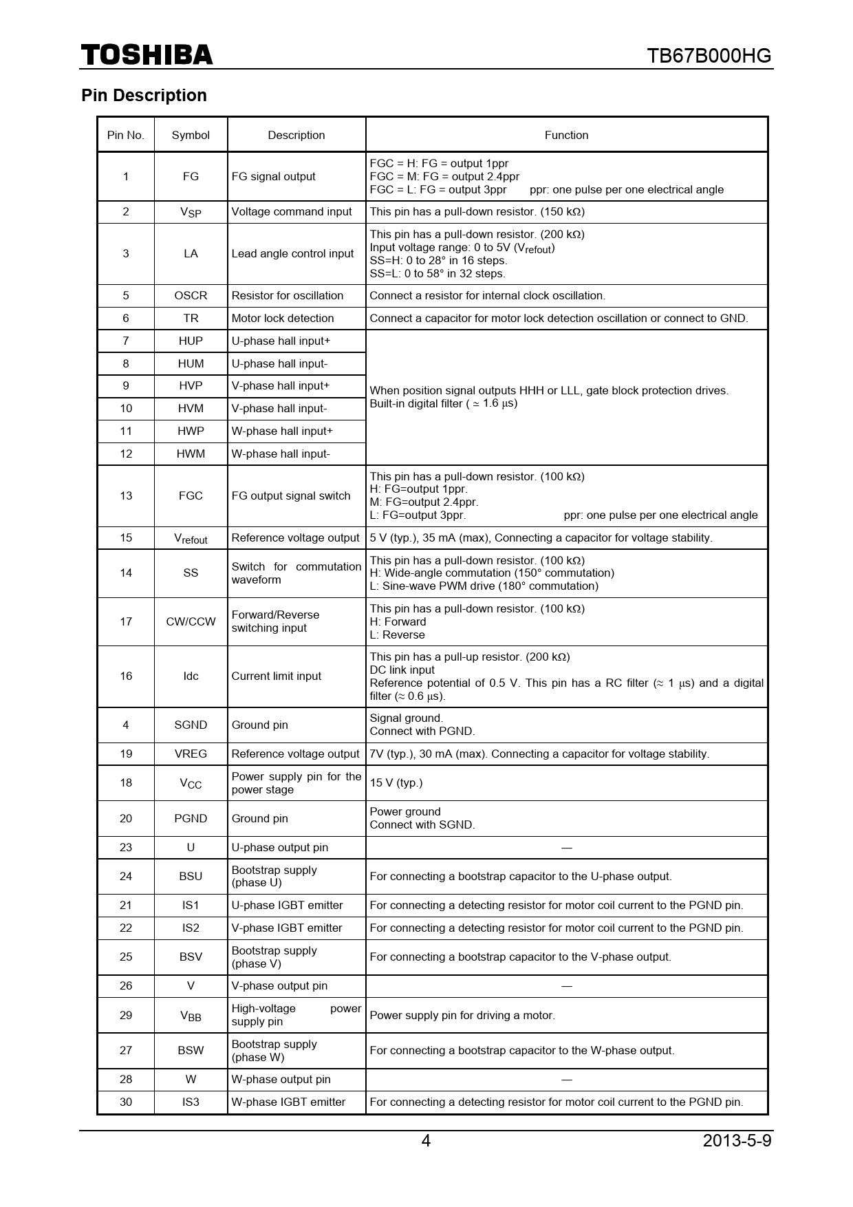 Pin No. Symbol Description Function FGC = H: FG = output 1ppr 1 FG FG signal output FGC = M: FG = output 2.4ppr FGC = L: FG = output 3ppr ppr: one pulse per one electrical angle 2 VSP Voltage command input This pin has a pull-down resistor. (150 kΩ) This pin has a pull-down resistor. (200 kΩ) Input voltage range: 0 to 5V (V 3 LA Lead angle control input refout) SS=H: 0 to 28° in 16 steps. SS=L: 0 to 58° in 32 steps. 5 OSCR Resistor for oscillation Connect a resistor for internal clock oscillation. 6 TR Motor lock detection Connect a capacitor for motor lock detection oscillation or connect to GND. 7 HUP U-phase hall input+ 8 HUM U-phase hall input- 9 HVP V-phase hall input+ When position signal outputs HHH or LLL, gate block protection drives. 10 HVM V-phase hall input- Built-in digital filter ( ∼− 1.6 μs) 11 HWP W-phase hall input+ 12 HWM W-phase hall input- This pin has a pull-down resistor. (100 kΩ) H: FG=output 1ppr. 13 FGC FG output signal switch M: FG=output 2.4ppr. L: FG=output 3ppr. ppr: one pulse per one electrical angle 15 Vrefout Reference voltage output 5 V (typ.), 35 mA (max), Connecting a capacitor for voltage stability. This pin has a pull-down resistor. (100 k Switch for commutation Ω) 14 SS H: Wide-angle commutation (150° commutation) waveform L: Sine-wave PWM drive (180° commutation) This pin has a pull-down resistor. (100 k Forward/Reverse Ω) 17 CW/CCW H: Forward switching input L: Reverse This pin has a pull-up resistor. (200 kΩ) DC link input 16 Idc Current limit input Reference potential of 0.5 V. This pin has a RC filter (≈ 1 μs) and a digital filter (≈ 0.6 μs). Signal ground. 4 SGND Ground pin Connect with PGND. 19 VREG Reference voltage output 7V (typ.), 30 mA (max). Connecting a capacitor for voltage stability. Power supply pin for the 18 VCC 15 V (typ.) power stage Power ground 20 PGND Ground pin Connect with SGND. 23 U U-phase output pin ― Bootstrap supply 24 BSU For connecting a bootstrap capacitor to the U-phase output. (phase U) 21 IS1 U-phase IGBT emitter For connecting a detecting resistor for motor coil current to the PGND pin. 22 IS2 V-phase IGBT emitter For connecting a detecting resistor for motor coil current to the PGND pin. Bootstrap supply 25 BSV For connecting a bootstrap capacitor to the V-phase output. (phase V) 26 V V-phase output pin ― High-voltage power 29 VBB Power supply pin for driving a motor. supply pin Bootstrap supply 27 BSW For connecting a bootstrap capacitor to the W-phase output. (phase W) 28 W W-phase output pin ― 30 IS3 W-phase IGBT emitter For connecting a detecting resistor for motor coil current to the PGND pin. 4 2013-5-9 Document Outline TOSHIBA Bi-CMOS Power Integrated Circuit Multi-Chip Package (MCP) Features Block Diagram Pin Assignment Pin Description Absolute Maximum Ratings (Ta = 25°C) Operating conditions (Ta = 25°C) Package Power Dissipation Electrical Characteristics (Ta = 25°C) Functional Description Timing Chart of FG Signal Timing Chart 1: Output waveform of sine-wave PWM drive Timing Chart 2: Output waveform of sine-wave PWM drive Timing Chart 3: Output waveform of wide-angle commutation Timing Chart 4: Output waveform of wide-angle commutation Timing Chart 5: Output waveform of square-wave drive Timing Chart 6: Output waveform of square-wave drive Timing Chart 7: Output waveform of square-wave drive Timing Chart 8: Output waveform of square-wave drive Application Circuit External Parts Package Dimensions