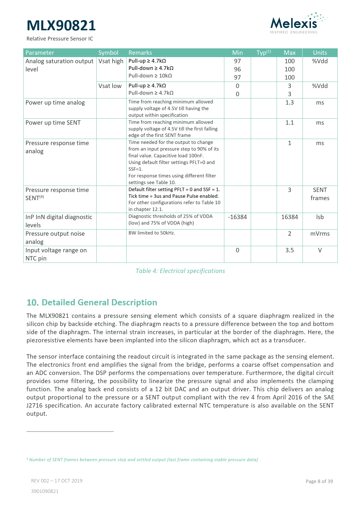 The MLX90821 contains a pressure sensing element which consists of a square diaphragm realized in the silicon chip by backside etching. The diaphragm reacts to a pressure difference between the top and bottom side of the diaphragm. The internal strain increases, in particular at the border of the diaphragm. Here, the piezoresistive elements have been implanted into the silicon diaphragm, which act as a transducer. The sensor interface containing the readout circuit is integrated in the same package as the sensing element. The electronics front end amplifies the signal from the bridge, performs a coarse offset compensation and an ADC conversion. The DSP performs the compensations over temperature. Furthermore, the digital circuit provides some filtering, the possibility to linearize the pressure signal and also implements the clamping function. The analog back end consists of a 12 bit DAC and an output driver. This chip delivers an analog output proportional to the pressure or a SENT output compliant with the rev 4 from April 2016 of the SAE J2716 specification. An accurate factory calibrated external NTC temperature is also available on the SENT output. 4 Number of SENT frames between pressure step and settled output (last frame containing stable pressure data) REV 002 – 17 OCT 2019 Page 8 of 39 3901090821